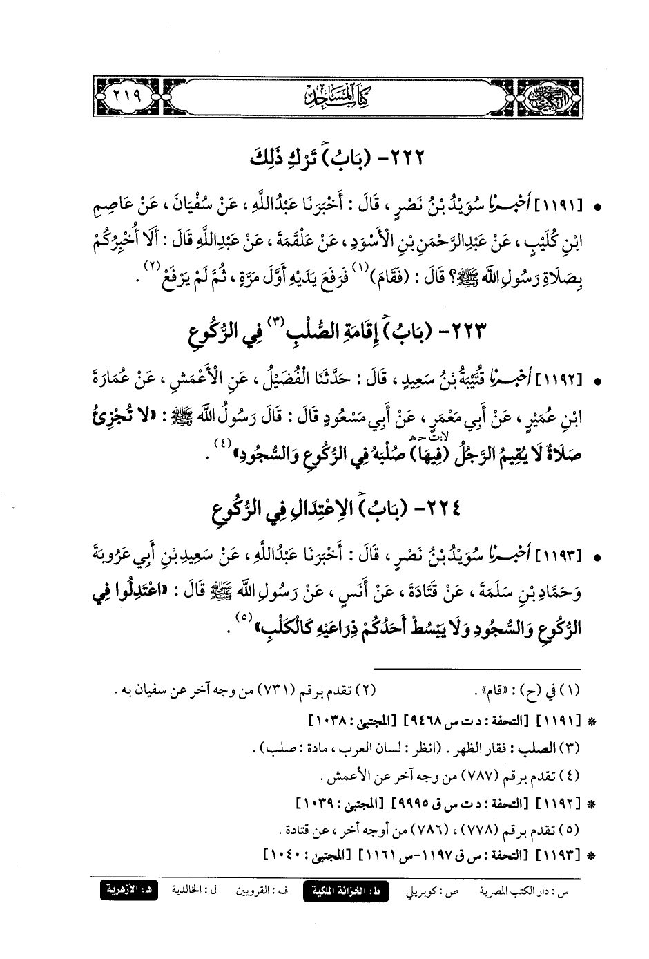 1192- أَخبَرنا قُتَيبَةُ بنُ سَعِيدٍ، قَالَ: حَدثنا الفُضَيْلُ، عَنِ الأَعْمَشِ، عَن عُمَارَةَ بنِ عُمَيْرٍ، عَن أَبي مَعْمَرٍ، عَن أَبي مَسْعُودٍ، قَالَ: قَالَ رَسُولُ اللهِ صَلى الله عَليه وسَلم: لا تُجْزِئُ صَلاةٌ لا يُقِيمُ الرَّجُلُ فِيهَا صُلْبَهُ فِي الرُّكُوعِ، وَالسُّجُودِ.