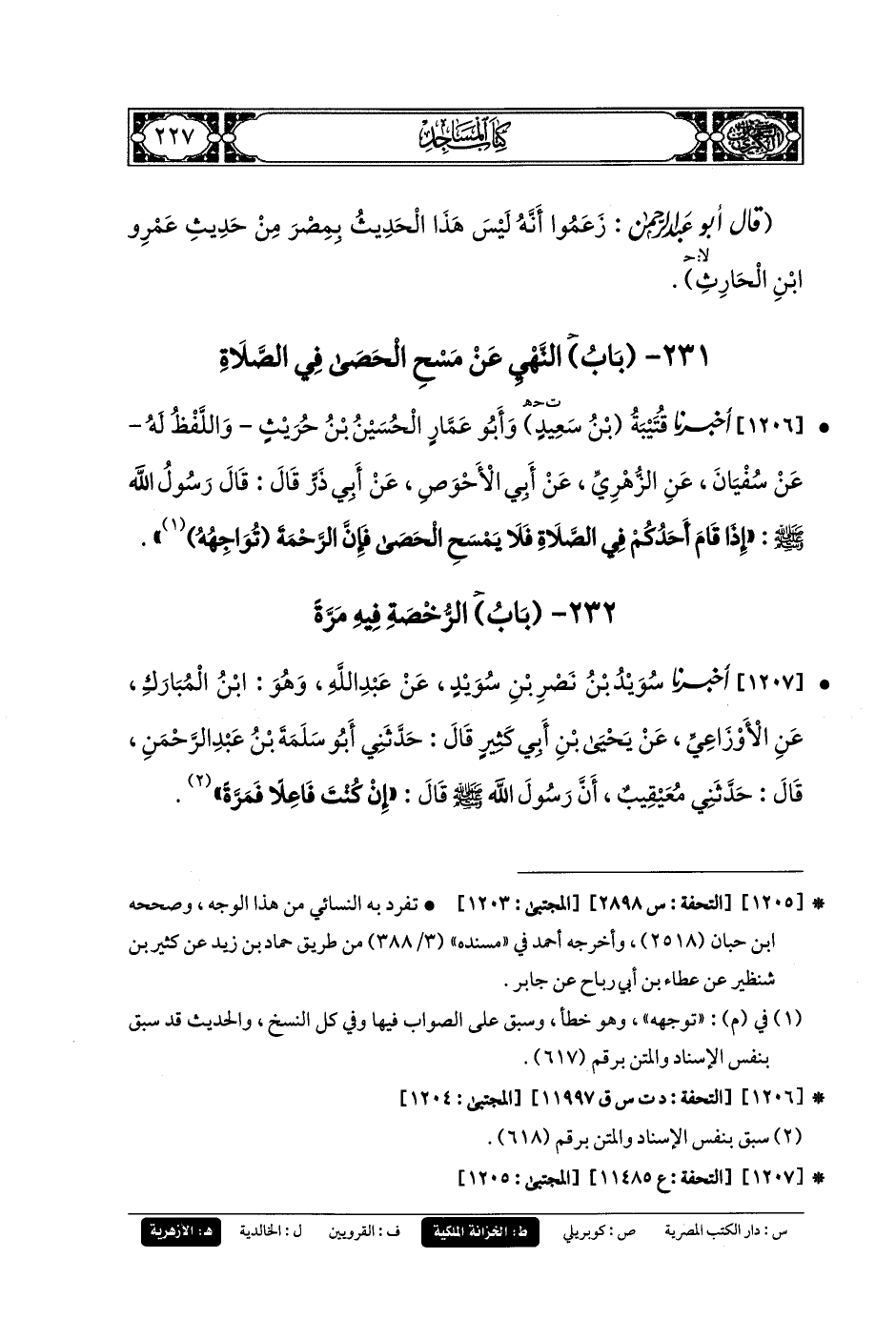1206- أَخبَرنا قُتَيبَةُ بنُ سَعِيدٍ، وَأَبو عَمَّارٍ الحُسَيْنُ بنُ حُرَيْثٍ، وَاللَّفْظُ لَهُ، عَن سُفيانَ، عَنِ الزُّهْرِيِّ، عَن أَبي الأَحْوَصِ، عَن أَبي ذَرٍّ، قَالَ: قَالَ رَسُولُ اللهِ صَلى الله عَليه وسَلم: إِذَا قَامَ أَحَدُكُمْ فِي الصَّلاةِ فَلا يَمْسَحُ الحَصَى، فَإِنَّ الرَّحْمَةَ تُوَاجِهُهُ.