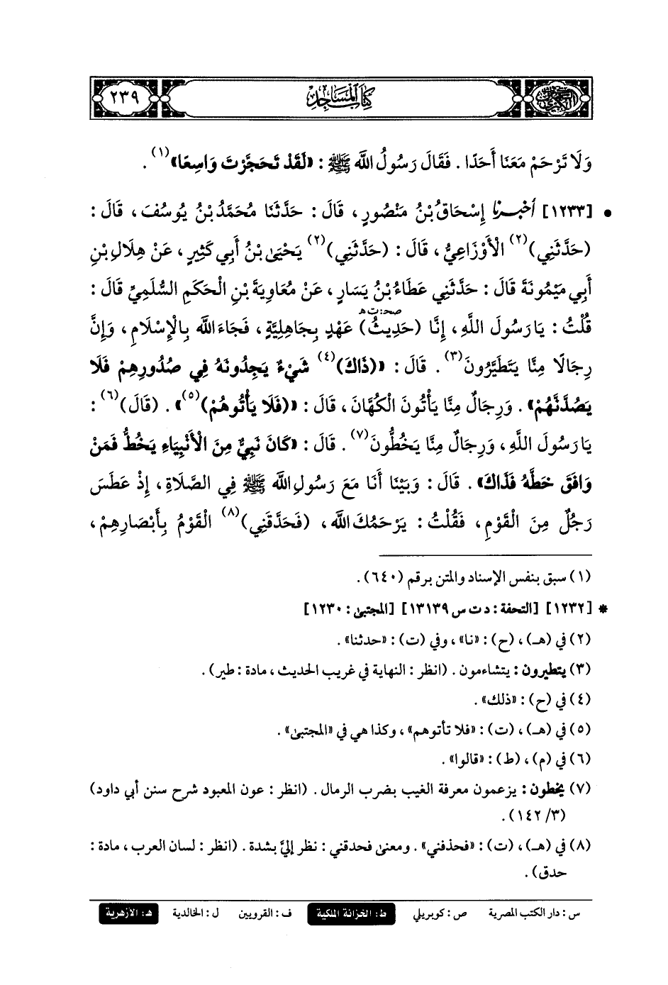 1233- أَخبَرنا إِسحَاقُ بنُ مَنصُورٍ، قَالَ: حَدثنا مُحَمدُ بنُ يُوسُفَ، قَالَ: حَدَّثني الأَوْزَاعِيُّ، قَالَ: حَدَّثني يَحيَى بنُ أَبي كَثِيرٍ، عَن هِلالِ بنِ أَبي مَيْمُونَةَ، قَالَ: حَدَّثني عَطَاءُ بنُ يَسَارٍ، عَن مُعاويَةَ بنِ الحَكَمِ السُّلَمِيِّ، قَالَ: قُلْتُ: يَا رَسُولَ اللهِ، إِنَّا حَدِيثُ عَهْدٍ بِجَاهِلِيَّةٍ، فَجَاءَ اللهُ بِالإِسلامِ، وَإِنَّ رِجَالاً مِنَّا يَتَطَيَّرُونَ، قَالَ: ذَاكَ شَيْءٌ يَجِدُونَهُ فِي صُدُورِهِمْ، فَلا يَصُدَّنَّهُمْ، وَرِجَالٌ مِنَّا يَأْتُونَ الكُهَّانَ، قَالَ: فَلا يَأْتُوهُمْ، قَالَ: يَا رَسُولَ اللهِ، وَرِجَالٌ مِنَّا يَخُطُّونَ، قَالَ: كَانَ نَبِيٌّ مِنَ الأَنْبِيَاءِ يَخُطُّ، فَمَنْ وَافَقَ خَطُّهُ فَذَاكَ، قَالَ: وَبَيْنَا أَنَا مَعَ رَسُولِ اللهِ صَلى الله عَليه وسَلم فِي الصَّلاةِ، إِذْ عَطَسَ رَجُلٌ مِنَ القَوْمِ، فَقُلْتُ: يَرْحَمُكَ اللهُ، فَحَدَّقَنِي القَوْمُ بِأَبْصَارِهِمْ، فَقُلْتُ: وَاثُكْلَ أُمِّيَا، مَا لَكُمْ تَنْظُرُونَ إِلَيَّ؟ قَالَ: فَضَرَبَ القَوْمُ بِأَيْدِيهِمْ عَلَى أَفْخَاذِهِمْ، فَلَمَّا رَأَيْتُهُمْ يُسَكِّتُونِي لَكِنِّي سَكَتُّ، فَلَمَّا انْصَرَفَ رَسُولُ اللهِ صَلى الله عَليه وسَلم دَعَانِي بِأَبي وَأُمِّي هُوَ مَا ضَرَبَنِي وَلا كَهَرَنِي وَلا سَبَّنِي، مَا رَأَيْتُ مُعَلِّمًا قَبْلَهُ وَلا بَعْدَهُ أَحْسَنَ تَعْلِيمًا مِنْهُ، قَالَ: إِنَّ صَلاتَنَا هَذِهِ لا يَصْلُحُ فِيهَا شَيْءٌ مِنْ كَلامِ النَّاسِ، إِنَّمَا هِيَ التَّسْبِيحُ وَالتَّكْبِيرُ، وَتِلاوَةُ القُرْآنِ، قَالَ: ثُمَّ اطَّلَعْتُ غَنِيمَةً لِي تَرْعَاهَا جَارِيَةٌ لِي فِي قِبَلِ أُحُدٍ وَالجَوَّانِيَّةِ، وَإِنِّي اطَّلَعْتُ فَوَجَدْتُ الذِّئْبَ قَدْ ذَهَبَ مِنْهَا بِشَاةٍ، وَأَنَا رَجُلٌ مِنْ بَنِي آدَمَ، آسَفُ كَمَا يَأْسَفُونَ، فَصَكَكْتُهَا صَكَّةً، ثُمَّ انْصَرَفْتُ إِلَى رَسُولِ اللهِ صَلى الله عَليه وسَلم فَأَخبَرْتُهُ، فَعَظَّمَ ذَلِكَ عَلَيَّ، فَقُلْتُ: يَا رَسُولَ اللهِ، أَفَلا أُعْتِقُهَا؟ قَالَ: ادْعُهَا، فَقَالَ لَهَا رَسُولُ اللهِ صَلى الله عَليه وسَلم: أَيْنَ اللهُ؟ قَالَتْ: فِي السَّمَاءِ، قَالَ: مَنْ أَنَا؟ قَالَتْ: أَنْتَ رَسُولُ اللهِ، قَالَ: إِنَّهَا مُؤْمِنَةٌ فَأَعْتِقَهَا.