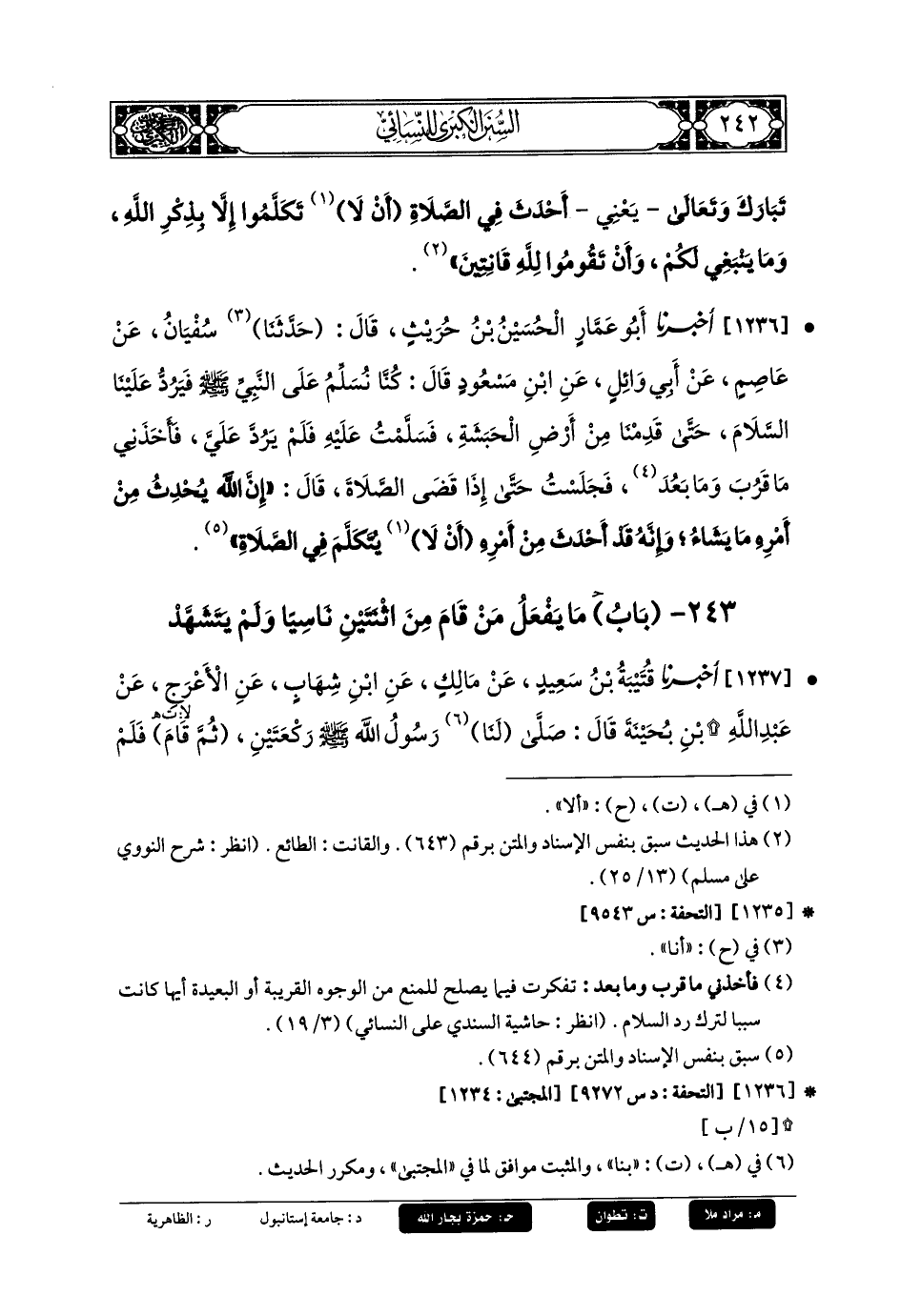 1236- أَخبَرنا أَبو عَمَّارٍ الحُسَيْنُ بنُ حُرَيْثٍ، قَالَ: حَدثنا سُفيانُ، عَن عَاصِمٍ، عَن أَبي وَائِلٍ، عَنِ ابنِ مَسْعُودٍ، قَالَ: كُنَّا نُسَلِّمُ عَلَى النَّبيِّ صَلى الله عَليه وسَلم فَيَرُدُّ عَلَيْنَا السَّلامَ، حَتَّى قَدِمْنَا مِنْ أَرْضِ الحَبَشَةِ، فَسَلَّمْتُ عَلَيْهِ فَلَمْ يَرُدَّ عَلَيَّ، فَأَخَذَنِي مَا قَرُبَ وَمَا بَعُدَ، فَجَلَسْتُ حَتَّى إِذَا قَضَى الصَّلاةُ، قَالَ: إِنَّ اللهَ يُحْدِثُ مِنْ أَمْرِهِ مَا يَشَاءُ، وَإِنَّهُ قَدْ أَحْدَثَ مِنْ أَمْرِهِ أَلا يُتَكَلَّمَ فِي الصَّلاةِ.