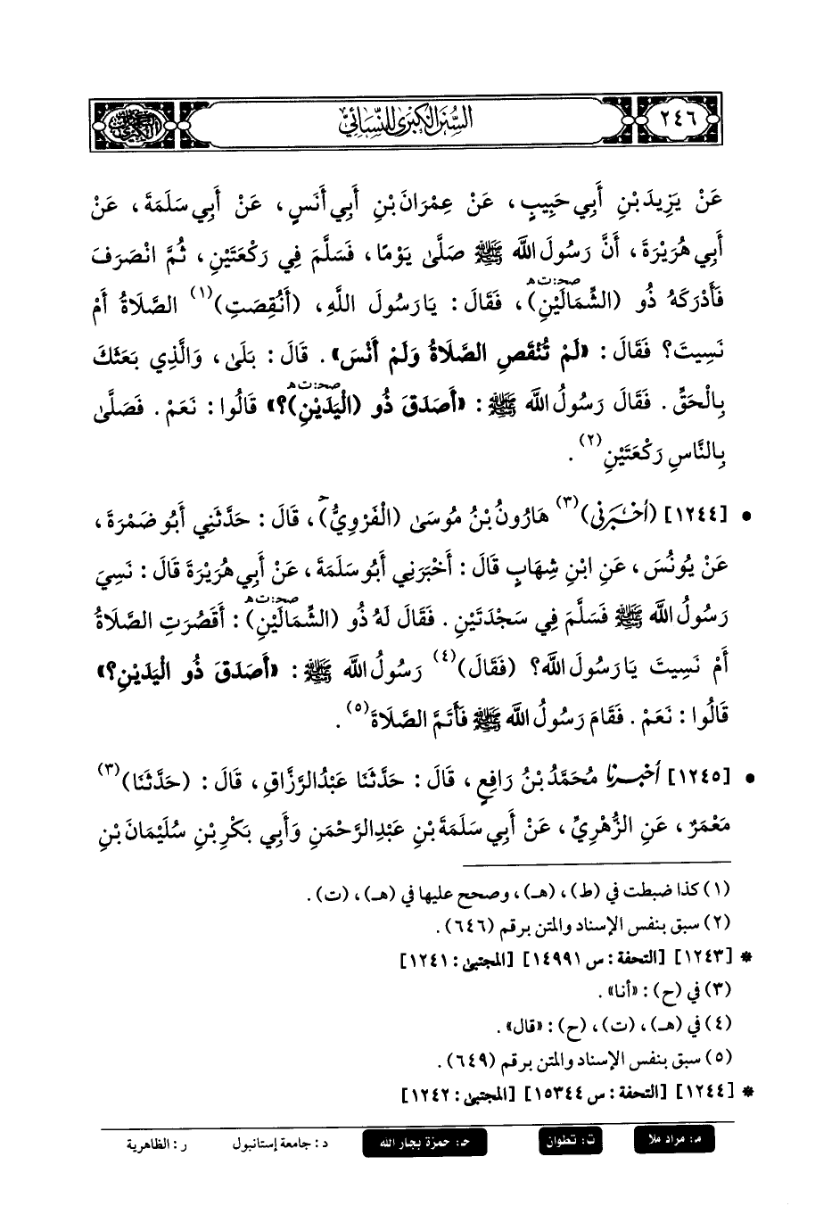 1244- أَخبَرني هَارُونُ بنُ مُوسَى الفروي، قَالَ: حَدَّثني أَبو ضَمْرَةَ، عَن يُونُسَ، عَنِ ابنِ شِهَابٍ، قَالَ: أَخبَرني أَبو سَلَمَةَ، عَن أَبي هُرَيرَةَ، قَالَ: نَسِيَ رَسُولُ اللهِ صَلى الله عَليه وسَلم فَسَلَّمَ فِي سَجْدَتَيْنِ، فَقَالَ لَهُ ذُو الشِّمَالَيْنِ: أَقُصِرَتِ الصَّلاةُ أَمْ نَسِيتَ يَا رَسُولَ اللهِ؟ فَقَالَ رَسُولُ اللهِ صَلى الله عَليه وسَلم: أَصَدَقَ ذُو اليَدَيْنِ؟ قَالُوا: نَعَمْ، فَقَامَ رَسُولُ اللهِ صَلى الله عَليه وسَلم فَأَتَمَّ الصَّلاةَ.