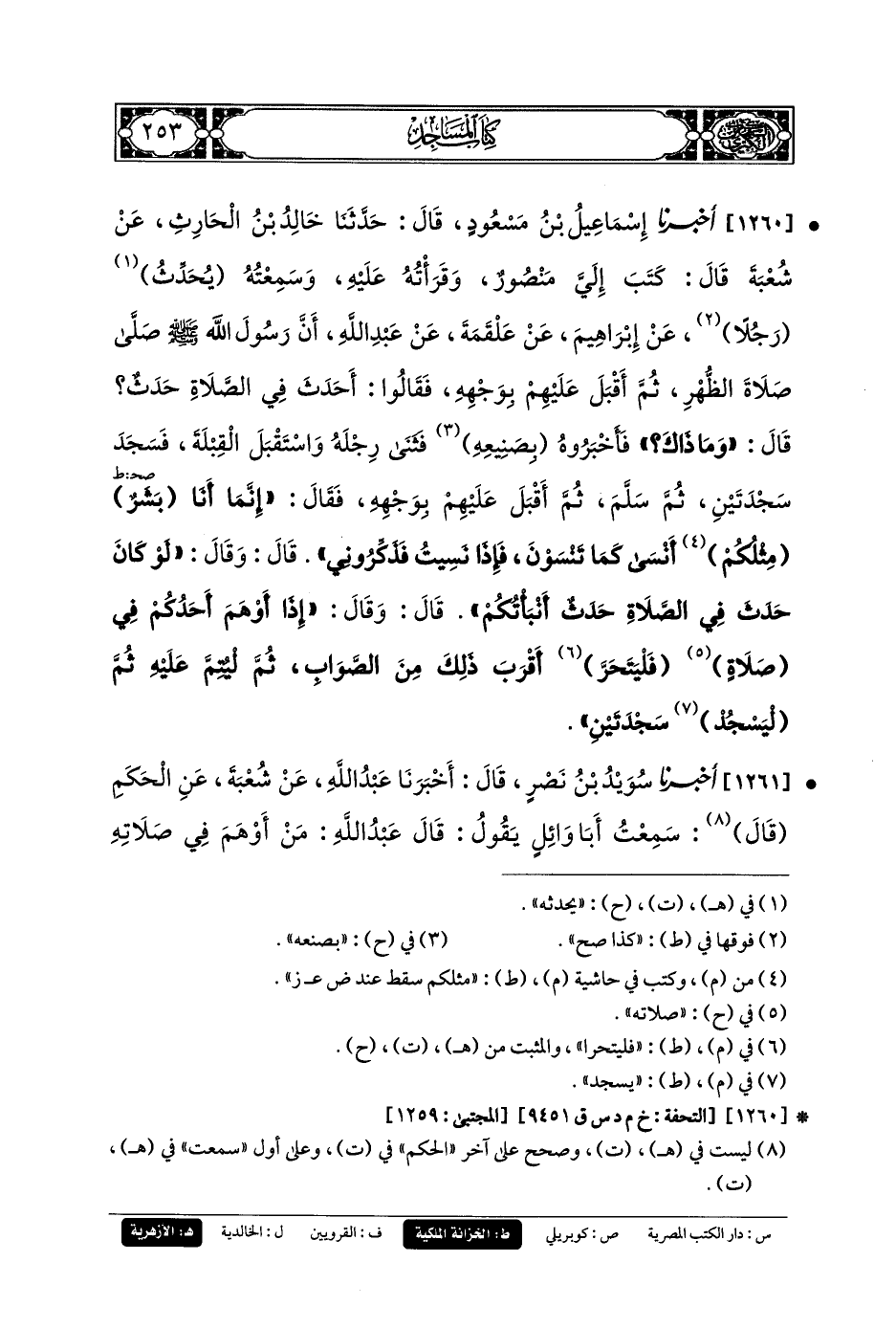 1260- أَخبَرَنَا إِسمَاعِيلُ بنُ مَسْعُودٍ، قَالَ: حَدثنا خَالِدُ بنُ الحَارِثِ، عَن شُعبَةَ، قَالَ: كَتَبَ إِلَيَّ مَنصُورٌ، وَقَرَأْتُهُ عَلَيْهِ، وَسَمِعْتُهُ يُحَدِّثُ رَجُلاً عَن إِبرَاهِيمَ، عَن عَلْقَمَةَ، عَن عَبدِ اللهِ، أَنَّ رَسُولَ اللهِ صَلى الله عَليه وسَلم صَلَّى صَلاةَ الظُّهْرِ، ثُمَّ أَقْبَلَ عَلَيْهِمْ بِوَجْهِهِ، فَقَالُوا: أَحْدَثَ فِي الصَّلاةِ حَدَثٌ، قَالَ: وَمَا ذَاكَ، فَأَخبَرُوهُ بِصَنِيعِهِ، فَثَنَى رِجْلَهُ وَاسْتَقْبَلَ القِبْلَةَ، فَسَجَدَ سَجْدَتَيْنِ، ثُمَّ سَلَّمَ، ثُمَّ أَقْبَلَ عَلَيْهِمْ بِوَجْهِهِ، فَقَالَ: إِنَّمَا أَنَا بِشْرٌ مِثْلُكُمْ أَنْسَى كَمَا تَنْسَوْنَ، فَإِذَا نَسِيتُ فَذَكِّرُونِي، قَالَ: وَقَالَ: لَوْ كَانَ حَدَثَ فِي الصَّلاةِ حَدَثٌ أَنْبَأْتُكُمْ، قَالَ: وَقَالَ: إِذَا أَوْهَمَ أَحَدُكُمْ فِي صَلاةٍ، فَلْيَتَحَرَّ أَقْرَبَ ذَلِكَ مِنَ الصَّوَابِ، ثُمَّ لِيُتِمَّ عَلَيْهِ، ثُمَّ لِيَسْجُدْ سَجْدَتَيْنِ.