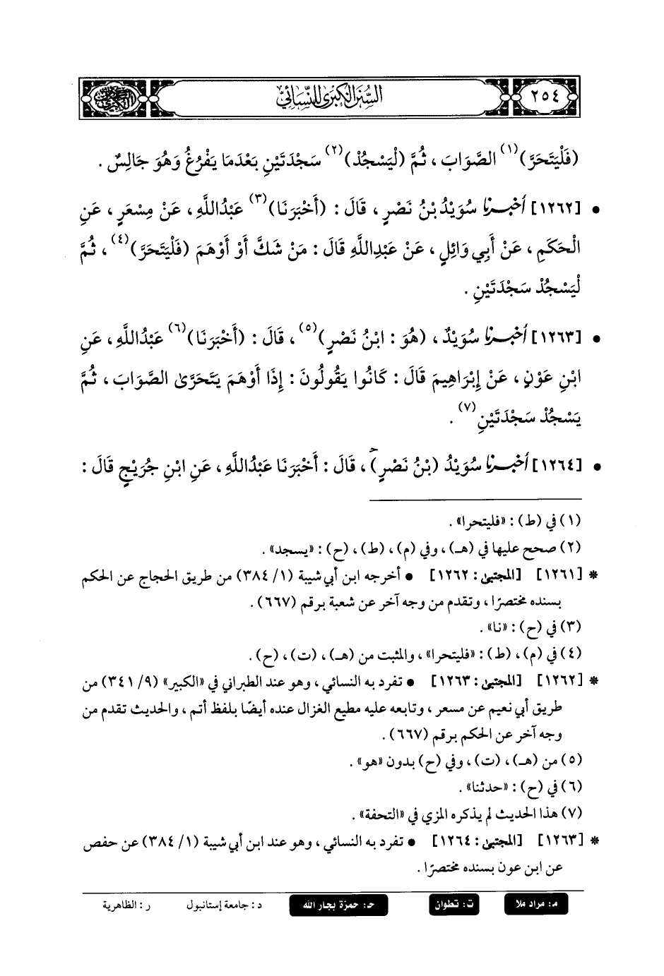 1262- أَخبَرنا سُوَيْدُ بنُ نَصْرٍ، قَالَ: أَخبَرنا عَبدُ اللهِ، عَن مِسْعَرٍ، عَنِ الحَكَمِ، عَن أَبي وَائِلٍ، عَن عَبدِ اللهِ قَالَ: مَنْ شَكَّ أَوْ أَوْهَمَ فَلْيَتَحَرَّ، ثُمَّ لِيَسْجُدَ سَجْدَتَيْنِ.