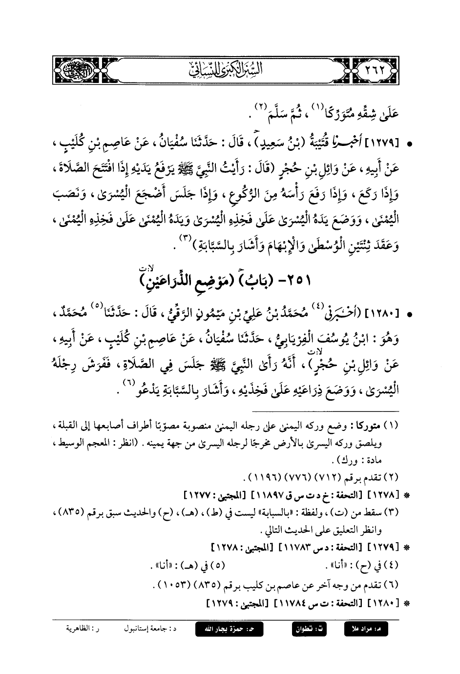 1279- أَخبَرنا قُتَيبَةُ بن سعيد، قَالَ: حَدثنا سُفيانُ، عَن عَاصِمِ بنِ كُلَيْبٍ، عَن أَبيهِ، عَن وَائِلِ بنِ حُجْرٍ، قَالَ: رَأَيْتُ النَّبيَّ صَلى الله عَليه وسَلم يَرْفَعُ يَدَيْهِ: إِذَا افْتَتَحَ الصَّلاةَ، وَإِذَا رَكَعَ، وَإِذَا رَفَعَ رَأْسَهُ مِنَ الرُّكُوعِ، وَإِذَا جَلَسَ أَضْجَعَ اليُسْرَى وَنَصَبَ اليُمْنَى، وَوَضَعَ يَدَهُ اليُسْرَى عَلَى فَخِذِهِ اليُسْرَى، وَيَدَهُ اليُمْنَى عَلَى فَخِذِهِ اليُمْنَى، وَعَقَدَ ثِنْتَيْنِ: الوُسْطَى وَالإِبْهَامَ، وَأَشَارَ بِالسَّبَّابَةِ.