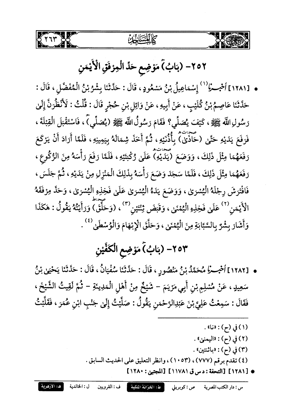 1281- أَخبَرنا إِسمَاعِيلُ بنُ مَسْعُودٍ، قَالَ: حَدثنا بِشْرُ بنُ المُفَضَّلِ، قَالَ: حَدثنا عَاصِمُ بنُ كُلَيْبٍ، عَن أَبيهِ، عَن وَائِلِ بنِ حُجْرٍ، قَالَ: قُلْتُ: لأَنْظُرَنَّ إِلَى رَسُولِ اللهِ صَلى الله عَليه وسَلم كَيْفَ يُصَلِّي، فَقَامَ رَسُولُ اللهِ صَلى الله عَليه وسَلم يصلي فَاسْتَقْبَلَ القِبْلَةَ، فَرَفَعَ يَدَيْهِ حَتَّى حَاذَى بِأُذُنَيْهِ، ثُمَّ أَخَذَ شِمَالَهُ بِيَمِينِهِ، فَلَمَّا أَرَادَ أَنْ يَرْكَعَ رَفَعَهُمَا مِثْلَ ذَلِكَ، وَوَضَعَ يَدَيْهِ عَلَى رُكْبَتَيْهِ، فَلَمَّا رَفَعَ رَأْسَهُ مِنَ الرُّكُوعِ رَفَعَهُمَا مِثْلَ ذَلِكَ، فَلَمَّا سَجَدَ وَضْعَ رَأْسَهُ بِذَلِكَ المَنْزِلِ مِنْ يَدَيْهِ، ثُمَّ جَلَسَ فَافْتَرَشَ رِجْلَهُ اليُسْرَى، وَوَضَعَ يَدَهُ اليُسْرَى عَلَى فَخِذِهِ اليُسْرَى، وَحَّدَ مِرْفَقَهُ الأَيْمَنَ عَلَى فَخِذِهِ اليُمْنَى، وَقَبَضَ ثِنْتَيْنِ وَحَلَّقَ، وَرَأَيْتُهُ يَقُولُ هَكَذَا، وَأَشَارَ بِشْرٌ بِالسَّبَّابَةِ مِنَ اليُمْنَى، وَحَلَّقَ الإِبْهَامَ وَالوُسْطَى.