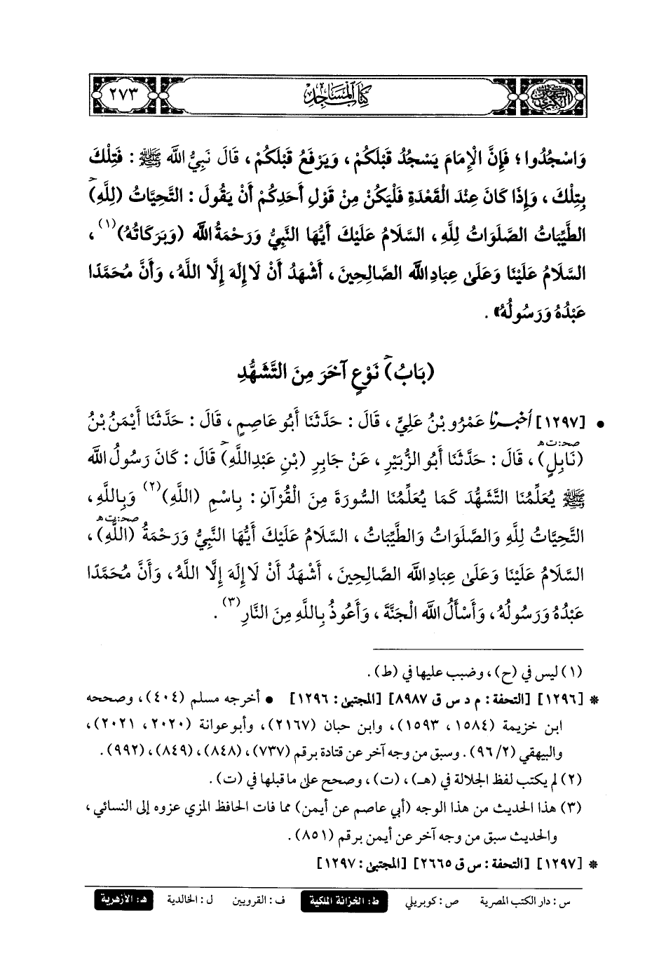 1297- أَخبَرنا عَمرُو بنُ عَليٍّ، قال حَدثنا أَبو عَاصِمٍ، قال حَدثنا أَيْمَنُ بنُ نَابِلٍ، قَالَ: حَدثنا أَبو الزُّبَيْرِ، عَن جَابِرٍ بن عبد الله، قَالَ: كَانَ رَسُولُ اللهِ صَلى الله عَليه وسَلم يُعَلِّمُنَا التَّشَهُّدَ كَمَا يُعَلِّمُنَا السُّورَةَ مِنَ القُرْآنِ: بِاسْمِ اللهِ وَبِاللَّهِ، التَّحِيَّاتُ للهِ، وَالصَّلَوَاتُ وَالطَّيِّبَاتُ، السَّلامُ عَلَيْكَ أَيُّهَا النَّبيُّ وَرَحْمَةُ اللهِ، السَّلامُ عَلَيْنَا وَعَلَى عِبَادِ اللهِ الصَّالِحِينَ، أَشْهَدُ أَنْ لا إِلَهَ إِلاَّ اللهُ، وَأَنَّ مُحَمدًا عَبدُهُ وَرَسُولُهُ، وَأَسْأَلُ اللهَ الجَنَّةَ وَأَعُوذُ بِاللهِ مِنَ النَّارِ.