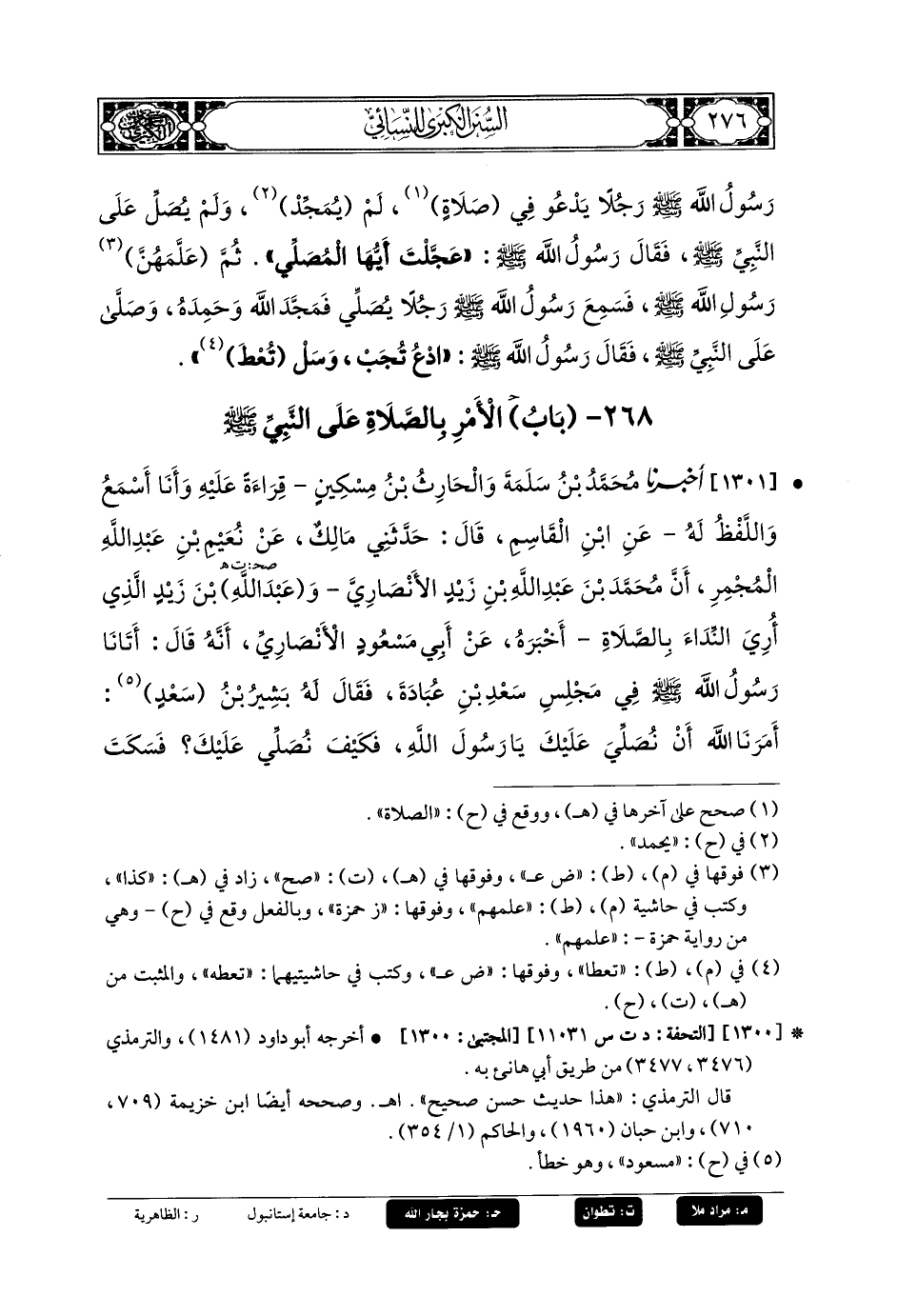 1301- أَخبَرنا مُحَمدُ بنُ سَلَمَةَ، وَالحَارِثُ بنُ مِسْكِينٍ، قِرَاءَةً عَلَيْهِ، وَأنا أَسْمَعُ، وَاللَّفْظُ لَهُ، عَنِ ابنِ القَاسِمِ، قَالَ: حَدَّثني مَالِكٌ، عَن نُعَيْمِ بنِ عَبدِ اللهِ المُجْمِرِ، أَنَّ مُحَمدَ بنَ عَبدِ اللهِ بنِ زَيْدٍ الأَنْصَارِيَّ، وَعَبدَ اللهِ بْنَ زَيْدٍ الَّذِي أُرِيَ النِّدَاءَ بِالصَّلاةِ، أَخبَرَهُ عَن أَبي مَسْعُودٍ الأَنْصَارِيِّ، أَنَّهُ قَالَ: أَتَانَا رَسُولُ اللهِ صَلى الله عَليه وسَلم فِي مَجْلِسِ سَعْدِ بنِ عُبَادَةَ، فَقَالَ لَهُ بَشِيرُ بنُ سَعْدٍ: أَمَرَنَا اللهُ أَنْ نُصَلِّيَ عَلَيْكَ يَا رَسُولَ اللهِ، فَكَيْفَ نُصَلِّي عَلَيْكَ؟ فَسَكَتَ رَسُولُ اللهِ صَلى الله عَليه وسَلم حَتَّى تَمَنَّيْنَا أَنَّهُ لَمْ يَسْأَلْهُ، ثُمَّ قَالَ: قُولُوا: اللهُمَّ صَلِّ عَلَى مُحَمدٍ وَعَلَى آلِ مُحَمدٍ، كَمَا صَلَّيْتَ عَلَى آلِ إِبرَاهِيمَ، وَبَارِكْ عَلَى مُحَمدٍ وَعَلَى آلِ مُحَمدٍ، كَمَا بَارَكْتَ عَلَى آلِ إِبرَاهِيمَ فِي العَالَمِينَ إِنَّكَ حَمِيدٌ مَجِيدٌ، وَالسَّلامُ كَمَا قَدْ عَلِمْتُمْ.