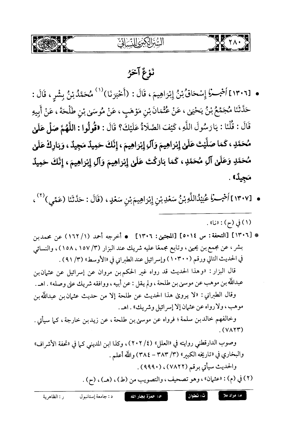 1306- أَخبَرنا إِسحَاقُ بنُ إِبرَاهِيمَ، قَالَ: أَخبَرنا مُحَمدُ بنُ بِشْرٍ، قَالَ: حَدثنا مُجَمِّعُ بنُ يَحيَى، عَن عُثْمَانَ بنِ مَوْهَبٍ، عَن مُوسَى بنِ طَلحَةَ، عَن أَبيهِ، قَالَ: قُلْنَا: يَا رَسُولَ اللهِ، كَيْفَ الصَّلاةُ عَلَيْكَ؟ قَالَ: قُولُوا: اللهُمَّ صَلِّ عَلَى مُحَمدٍ، كَمَا صَلَّيْتَ عَلَى إِبرَاهِيمَ، وَآلِ إِبرَاهِيمَ، إِنَّكَ حَمِيدٌ مَجِيدٌ، وَبَارِكْ عَلَى مُحَمدٍ، وَعَلَى آلِ مُحَمدٍ، كَمَا بَارَكْتَ عَلَى إِبرَاهِيمَ، وَآلِ إِبرَاهِيمَ، إِنَّكَ حَمِيدٌ مَجِيدٌ.