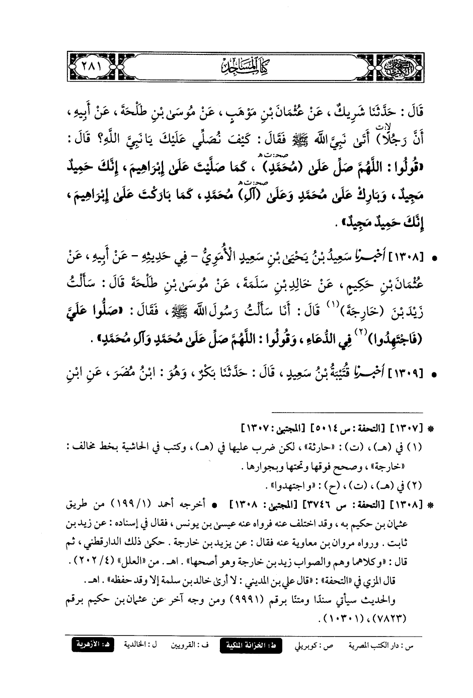 1308- أَخبَرنا سَعِيدُ بنُ يَحيَى بنِ سَعِيدٍ الأُمَوِيُّ، فِي حَدِيثِهِ، عَن أَبيهِ، عَن عُثْمَانَ بنِ حَكِيمٍ، عَن خَالِدِ بنِ سَلَمَةَ، عَن مُوسَى بنِ طَلحَةَ، قَالَ: سَأَلْتُ زَيْدَ بْنَ خَارِجَةَ، قَالَ: أَنَا سَأَلْتُ رَسُولَ اللهِ صَلى الله عَليه وسَلم، فَقَالَ: صَلَّوْا عَلَيَّ، فاجْتَهِدُوا فِي الدُّعَاءِ، وَقُولُوا: اللهُمَّ صَلِّ عَلَى مُحَمدٍ وَآلِ مُحَمدٍ.