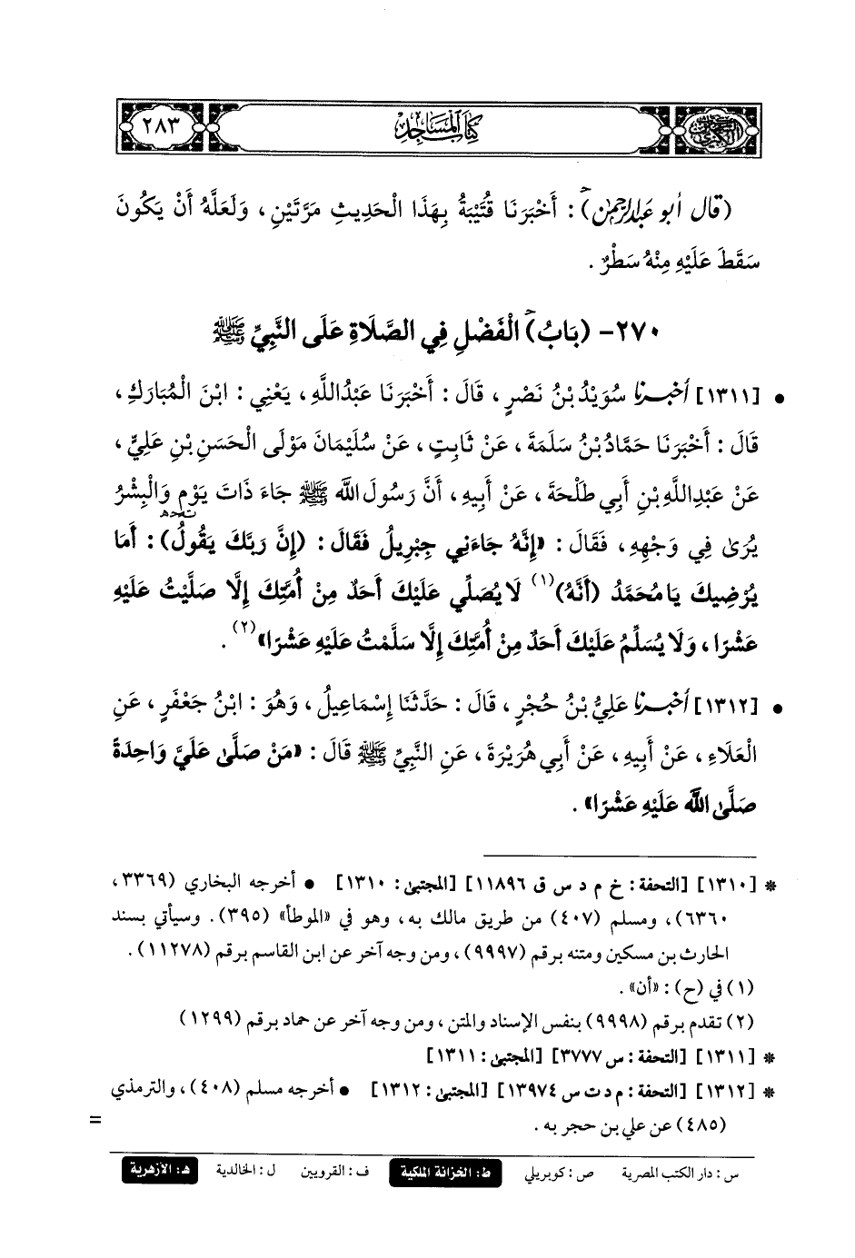 1311- أَخبَرنا سُوَيْدُ بنُ نَصْرٍ، قال أَخبَرنا عَبدُ اللهِ، يَعْنِي ابنَ المُبَارَكِ، قال أَخبَرنا حَمَّادُ بنُ سَلَمَةَ، عَن ثَابِتٍ، عَن سُلَيمَانَ، مَوْلَى الحَسَنِ بنِ عَليٍّ، عَن عَبدِ اللهِ بنِ أَبي طَلحَةَ، عَن أَبيهِ، أَنَّ رَسُولَ اللهِ صَلى الله عَليه وسَلم جَاءَ ذَاتَ يَوْمٍ وَالبِشْرُ يُرَى فِي وَجْهِهِ، فَقَالَ: إِنَّهُ جَاءَنِي جِبْرِيلُ، فَقَالَ: إِنَّ رَبِّكَ يَقُولُ: أَمَا يُرْضِيكَ يَا مُحَمدُ، أَنَّهُ لا يُصَلِّي عَلَيْكَ أَحَدٌ مِنْ أُمَّتِكَ إِلاَّ صَلَّيْتُ عَلَيْهِ عَشْرًا، وَلا يُسَلِّمُ عَلَيْكَ أَحَدٌ مِنْ أُمَّتِكَ إِلاَّ سَلَّمْتُ عَلَيْهِ عَشْرًا.