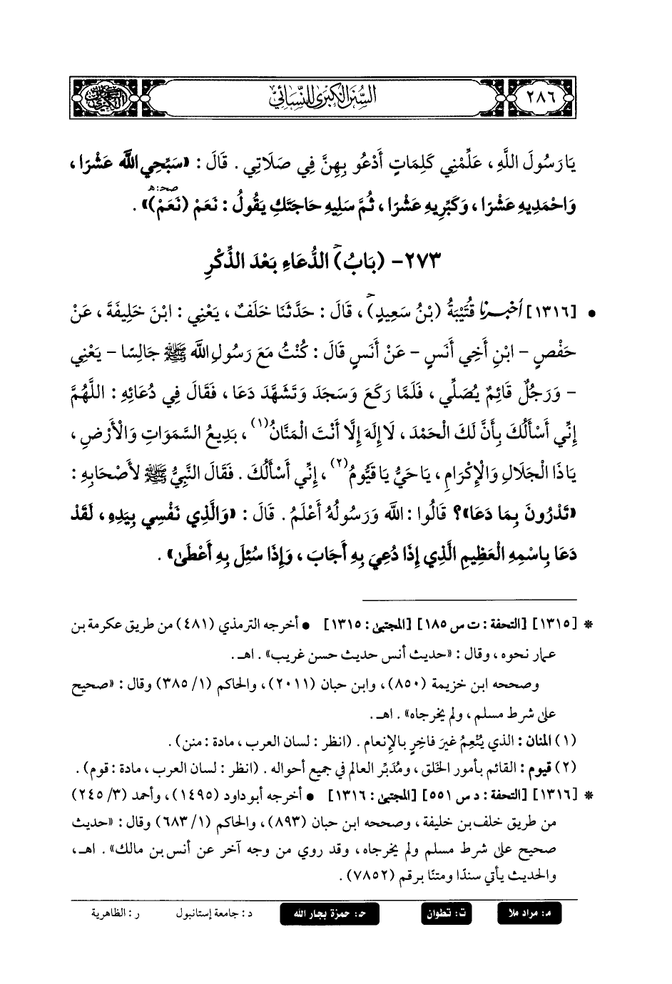 1316- أَخبَرنا قُتَيبَةُ بن سعيد، قَالَ: حَدثنا خَلْفٌ، يَعْنِي ابنَ خَلِيفَةَ، عَن حَفْصٍ ابنِ أَخِي أَنَسٍ، عَن أَنَسٍ، قَالَ: كُنْتُ مَعَ رَسُولِ اللهِ صَلى الله عَليه وسَلم جَالِسًا، يَعْنِي وَرَجُلٌ قَائِمٌ يُصَلِّي، فَلَمَّا رَكَعَ وَسَجَدَ وَتَشَهَّدَ دَعَا، فَقَالَ فِي دُعَائِهِ: اللهُمَّ إِنِّي أَسْأَلُكَ، بِأَنَّ لَكَ الحَمْدَ لا إِلَهَ إِلاَّ أَنْتَ المَنَّانُ، بَدِيعُ السَّمَاوَاتِ وَالأَرْضِ، يَا ذَا الجِلالِ وَالإِكْرَامِ، يَا حَيُّ يَا قَيُّومُ، إِنِّي أَسْأَلُكُ، فَقَالَ النَّبيُّ صَلى الله عَليه وسَلم لأَصْحَابِهِ: تَدْرُونَ بِمَا دَعَا؟ قَالُوا: اللهُ وَرَسُولُهُ أَعْلَمُ، قَالَ: وَالَّذِي نَفْسِي بِيَدِهِ، لَقَدْ دَعَا بِاسْمِهِ العَظِيمِ الَّذِي إِذَا دُعِيَ بِهِ أَجَابَ، وَإِذَا سُئِلَ بِهِ أَعْطَى.