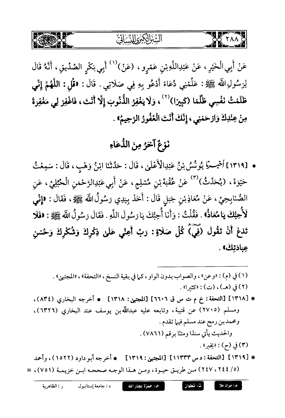 1319- أَخبَرنا يُونُسُ بنُ عَبدِ الأَعْلَى، قال حَدثنا ابنُ وَهْبٍ، قَالَ: سَمِعْتُ حَيْوَةَ يُحَدِّثُ عَن عُقْبَةَ بنِ مُسْلِمٍ، عَن أَبي عَبدِ الرَّحمَنِ الحُبُلِيِّ، عَنِ الصُّنَابِحِيِّ، عَن مُعَاذِ بنِ جَبَلٍ، قَالَ: أَخَذَ بِيَدِي رَسُولُ اللهِ صَلى الله عَليه وسَلم، فَقَالَ: إِنِّي لأُحِبُّكَ يَا مُعَاذُ، فَقُلْتُ: وَأَنَا أُحِبُّكُ يَا رَسُولَ اللهِ، فَقَالَ رَسُولُ اللهِ صَلى الله عَليه وسَلم: فَلا تَدَعْ أَنْ تَقُولَ فِي كُلِّ صَلاةٍ رَبِّ أَعِنِّي عَلَى ذِكْرِكَ، وَشُكْرِكَ، وَحَسَنِ عِبَادَتِكَ.