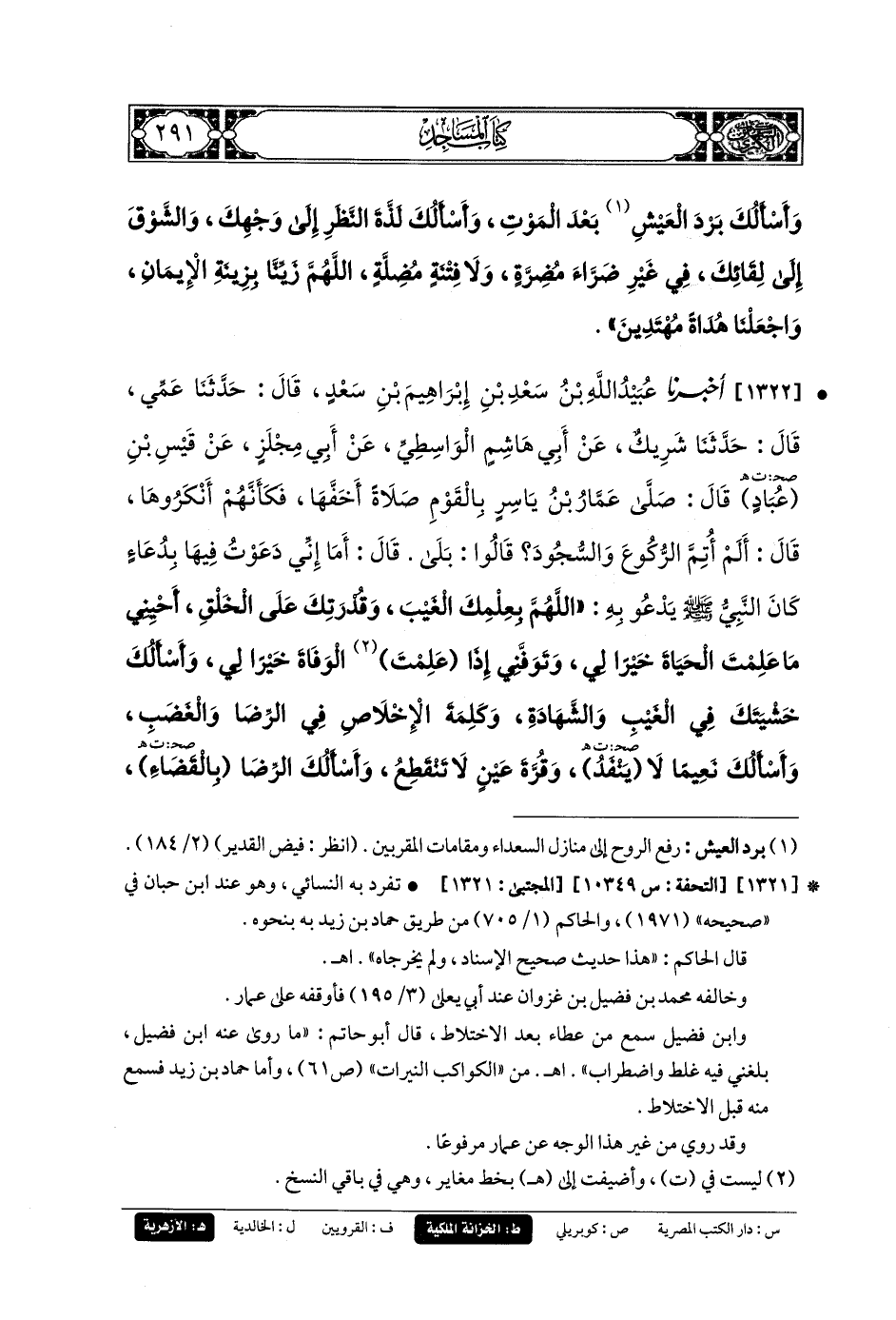 1322- أَخبَرنا عُبَيدُ اللهِ بنُ سَعْدِ بنِ إِبرَاهِيمَ بنِ سَعْدٍ، قَالَ: حَدثنا عَمِّي، قَالَ: حَدثنا شَرِيكٌ، عَن أَبي هَاشِمٍ الوَاسِطِيِّ، عَن أَبي مِجْلَزٍ، عَن قَيْسِ بنِ عُبَادٍ، قَالَ: صَلَّى عَمَّارُ بنُ يَاسِرٍ بِالقَوْمِ صَلاةً أَخَفَّهَا، فَكَأَنَّهُمْ أَنْكَرُوهَا، قَالَ: أَلَمْ أُتِمَّ الرُّكُوعَ وَالسُّجُودَ؟ قَالُوا: بَلَى، قَالَ: أَمَّا إِنِّي دَعَوْتُ فِيهَا بِدُعَاءٍ كَانَ النَّبيُّ صَلى الله عَليه وسَلم يَدْعُو بِهِ، اللهُمَّ بِعِلْمِكَ الغَيْبَ وَقُدْرَتِكَ عَلَى الخَلْقِ أَحْيِنِي مَا عَلِمْتَ الحَيَاةَ خَيْرًا لِي، وَتَوَفَّنِي إِذَا عَلِمْتَ الوَفَاةَ خَيْرًا لِي، وَأَسْأَلُكَ خَشْيَتِكَ فِي الغَيْبِ وَالشَّهَادَةِ، وَكَلِمَةَ الإِخْلاصِ فِي الرِّضَا وَالغَضَبِ، وَأَسْأَلُكَ نَعِيمًا لا يَنْفَدُ، وَقُرَّةَ عَيْنٍ لا تَنْقَطِعُ، وَأَسْأَلُكَ الرِّضَا بِالقَضَاءِ، وَبَرَدَ العَيْشِ بَعْدَ المَوْتِ، وَلَذَّةَ النَّظَرِ إِلَى وَجْهِكَ، وَالشَّوْقَ إِلَى لِقَائِكَ، وَأَعُوذُ بِكَ مِنْ ضَرَّاءَ مُضِرَّةٍ، وَفِتْنَةٍ مُضِلَّةٍ، اللهُمَّ زَيِّنَّا بِزِينَةِ الإِيمَانِ وَاجْعَلْنَا هُدَاةً مُهْتَدِينَ.