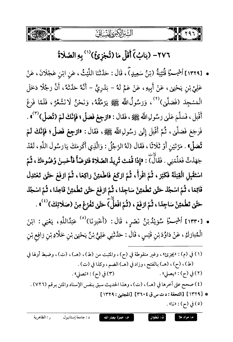 1330 - أَخبَرنا سُوَيْدُ بنُ نَصْرٍ، قال أَخبَرنا عَبدُ اللهِ، يَعْنِي ابنَ المُبَارَكِ، عَن دَاوُدَ بنِ قَيسٍ، قَالَ: حَدَّثني عَليُّ بنُ يَحيَى بنِ خَلاَّدِ بنِ رَافِعِ بنِ مَالِكٍ الأَنْصَارِيُّ، قَالَ: حَدَّثني أَبي، عَن عَمٍّ لَهُ بَدْرِيٍّ قَالَ: كُنْتُ مَعَ رَسُولِ اللهِ صَلى الله عَليه وسَلم جَالِسًا فِي المَسْجِدِ، فَدَخَلَ رَجُلٌ فَصَلَّى رَكْعَتَيْنِ، ثُمَّ جَاءَ فَسَلَّمَ عَلَى النَّبيِّ صَلى الله عَليه وسَلم، وَقَدْ كَانَ النَّبيُّ صَلى الله عَليه وسَلم يَرْمُقُهُ فِي صَلاتِهِ، فَرَدَّ عَلَيْهِ السَّلامَ، ثُمَّ قَالَ لَهُ: ارْجِعْ فَصَلِّ فَإِنَّكَ لَمْ تُصَلِّ، حَتَّى كَانَ عِنْدَ الثَّالِثَةِ، أَوِ الرَّابِعَةِ، فَقَالَ: وَالَّذِي أَنْزَلَ عَلَيْكَ الكِتَابَ لَقَدْ جَهَدْتُ وَحَرَصْتُ فَأَرِنِي وَعَلِّمْنِي، قَالَ: إِذَا أَرَدْتَ أَنْ تُصَلِّيَ فَتَوَضَّأْ، فَأَحْسِنْ وُضُوءَكَ، ثُمَّ اسْتَقْبِلِ القِبْلَةَ فَكَبِّرْ، ثُمَّ اقْرَأْ، ثُمَّ ارْكَعْ حَتَّى تَطْمَئِنَّ رَاكِعًا، ثُمَّ ارْفَعْ حَتَّى تَعْتَدِلَ قَائِمًا، ثُمَّ اسْجُدْ حَتَّى تَطْمَئِنَّ سَاجِدًا، ثُمَّ ارْفَعْ حَتَّى تَطْمَئِنَّ قَاعِدًا، ثُمَّ اسْجُدْ حَتَّى تَطْمَئِنَّ سَاجِدًا، ثُمَّ ارْفَعْ، فَإِذَا أَتْمَمْتَ صَلاتَكَ عَلَى هَذَا فَقَدْ تَمَّتْ صلاتك، وَمَا انْتَقَصْتَ مِنْ هَذَا فَإِنَّمَا تَنْتَقِصُهُ مِنْ صَلاتِكَ.