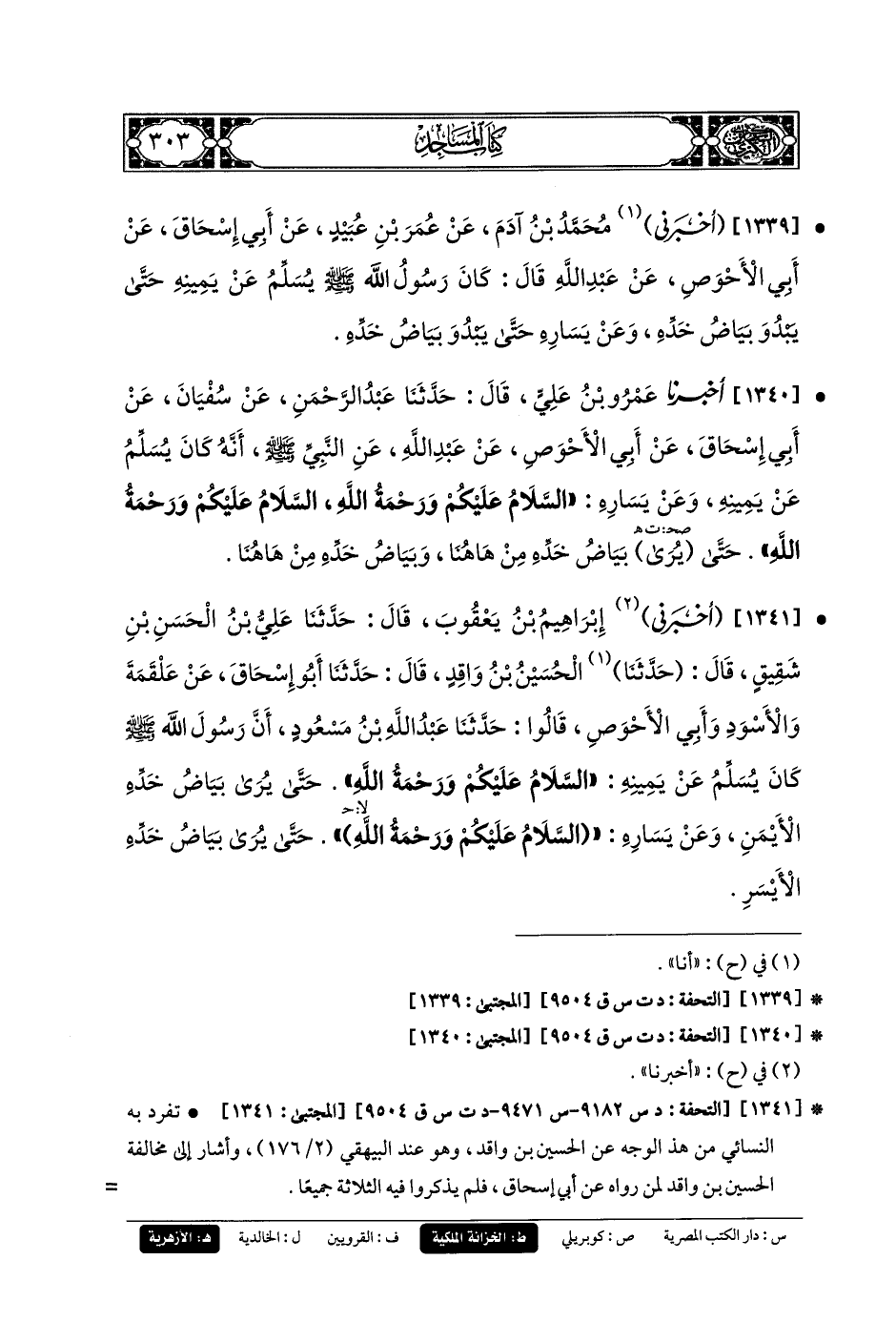 1340- أَخبَرنا عَمرُو بنُ عَليٍّ، قَالَ: حَدثنا عَبدُ الرَّحمَنِ، عَن سُفيانَ، عَن أَبي إِسحَاقَ، عَن أَبي الأَحْوَصِ، عَن عَبدِ اللهِ، عَنِ النَّبيِّ صَلى الله عَليه وسَلم، أَنَّهُ كَانَ يُسَلِّمُ عَن يَمِينِهِ وَعَن يَسَارِهِ: السَّلامُ عَلَيْكُمْ وَرَحْمَةُ اللهِ، السَّلامُ عَلَيْكُمْ وَرَحْمَةُ اللهِ، حَتَّى يُرَى بَيَاضُ خَدِّهِ مِنْ هَاهُنَا وَبَيَاضُ خَدِّهِ مِنْ هَاهُنَا.