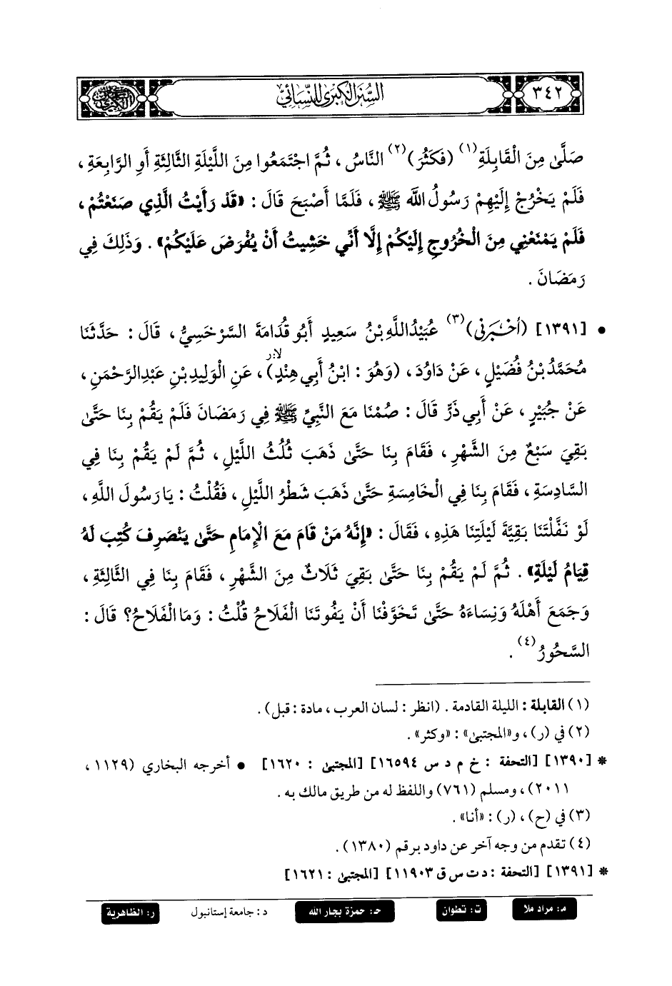 1391- أَخبَرني عُبَيدُ اللهِ بنِ سَعِيدٍ أَبو قُدَامَةَ السَّرَخْسِيُّ، قَالَ: حَدثنا مُحَمدُ بنُ فُضَيْلٍ، عَن دَاوُدَ، وَهُوَ ابنُ أَبي هِنْدٍ، عَنِ الوَلِيدِ بنِ عَبدِ الرَّحمَنِ، عَن جُبَيرٍ، عَن أَبي ذَرٍّ، قَالَ: صُمْنَا مَعَ النَّبيِّ صَلى الله عَليه وسَلم فِي رَمَضَانَ، فَلَمْ يَقُمْ بِنَا حَتَّى بَقِيَ سَبْعٌ مِنَ الشَّهْرِ، فَقَامَ بِنَا حَتَّى ذَهَبَ ثُلُثُ اللَّيْلِ، ثُمَّ لَمْ يَقُمْ بِنَا فِي السَّادِسَةِ، فَقَامَ بِنَا فِي الخَامِسَةِ، حَتَّى ذَهَبَ شَطْرُ اللَّيْلِ، فَقُلْتُ: يَا رَسُولَ اللهِ، لَوْ نَفَّلْتَنَا بَقِيَّةَ لَيْلَتِنَا هَذِهِ، فَقَالَ: إِنَّهُ مَنْ قَامَ مَعَ الإِمَامِ حَتَّى يَنْصَرِفَ، كُتِبَ لَهُ قِيَامُ لَيْلَةٍ، ثُمَّ لَمْ يَقُمْ بِنَا حَتَّى بَقِيَ ثَلاثٌ مِنَ الشَّهْرِ، فَقَامَ بِنَا فِي الثَّالِثَةِ، وَجَمْعَ أَهْلَهُ وَنِسَاءَهُ، حَتَّى تَخَوَّفْنَا أَنْ يَفُوتَنَا الفَلاحُ، قُلْتُ: وَمَا الفَلاحُ؟ قَالَ: السَّحُورُ.