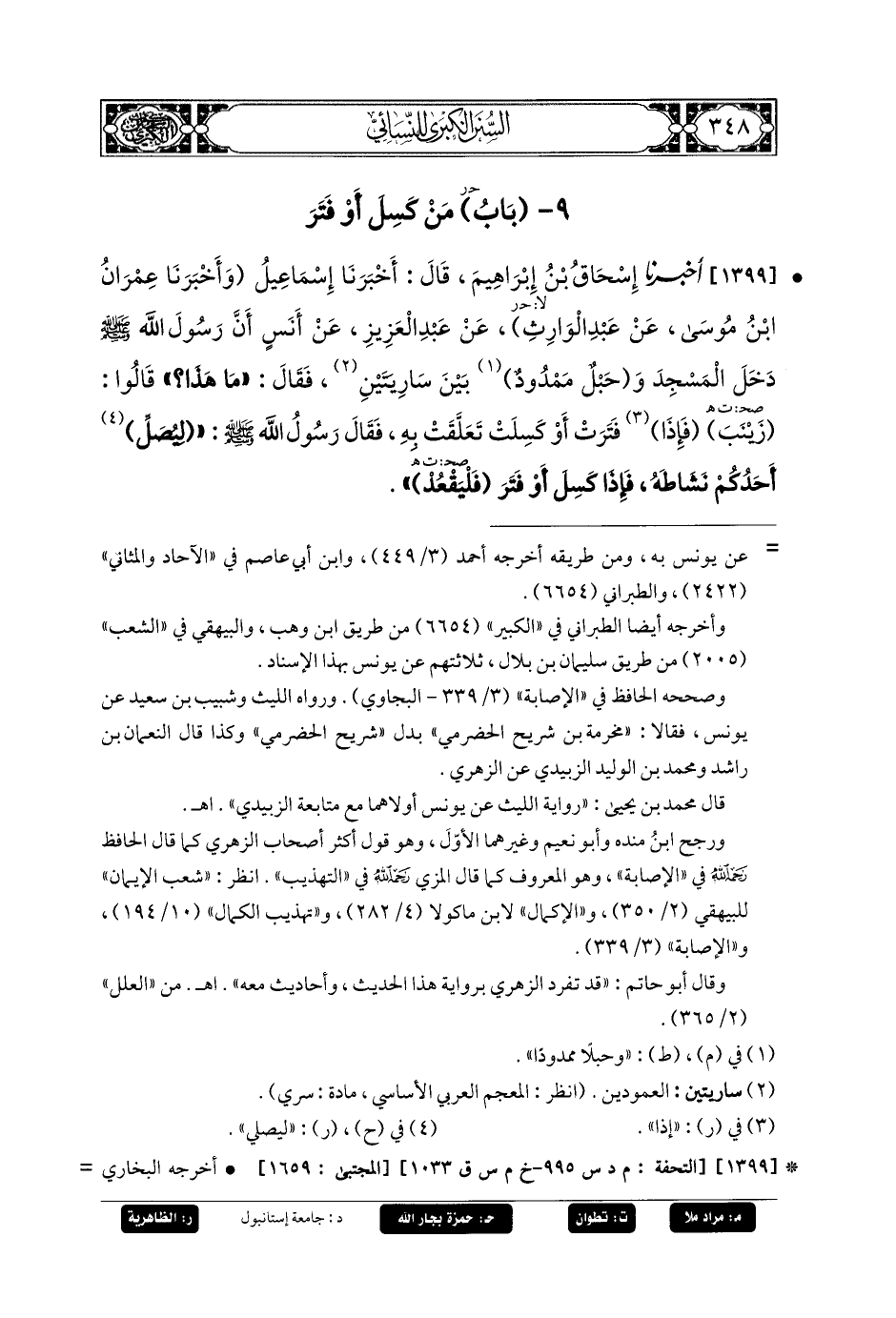 1399- أَخبَرنا إِسحَاقُ بنُ إِبرَاهِيمَ، قَالَ: أَخبَرنا إِسمَاعِيلُ وَأَخبَرنا عِمْرَانُ بنُ مُوسَى، عَن عَبدِ الوَارِثِ، عَن عَبدِ العَزِيزِ، عَن أَنَسٍ، أَنَّ رَسُولَ اللهِ صَلى الله عَليه وسَلم دَخَلَ المَسْجِدَ وَحَبْلٌ مَمْدُودٌ بَيْنَ سَارِيَتَيْنِ، فَقَالَ: مَا هَذَا؟ قَالُوا: زَيْنَبُ، فَإِذَا فَتَرَتْ أَوْ كَسِلَتْ تَعَلَّقَتْ بِهِ، فَقَالَ رَسُولُ اللهِ صَلى الله عَليه وسَلم: لِيُصَلِّ أَحَدُكُمْ نَشَاطَهُ، فَإِذَا كَسِلَ أَوْ فَتَرَ فَلْيَقْعُدْ.
