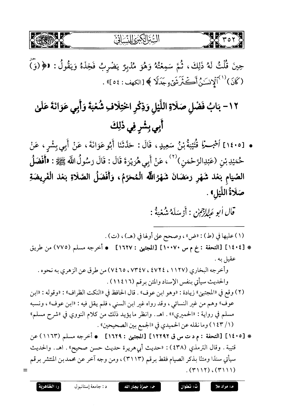 1405- أَخبَرنا قُتَيبَةُ بنُ سَعِيدٍ، قَالَ: حَدثنا أَبو عَوَانَةَ، عَن أَبي بِشْرٍ، عَن حُمَيْدِ بنِ عَبدِ الرَّحمَنِ، عَن أَبي هُرَيرَةَ، قَالَ: قَالَ رَسُولُ اللهِ صَلى الله عَليه وسَلم: أَفْضَلُ الصِّيَامِ بَعْدَ شَهْرِ رَمَضَانَ شَهْرُ اللهِ المُحَرَّمُ، وَأَفْضَلُ الصَّلاةِ بَعْدَ الفَرِيضَةِ صَلاةُ اللَّيْلِ.
