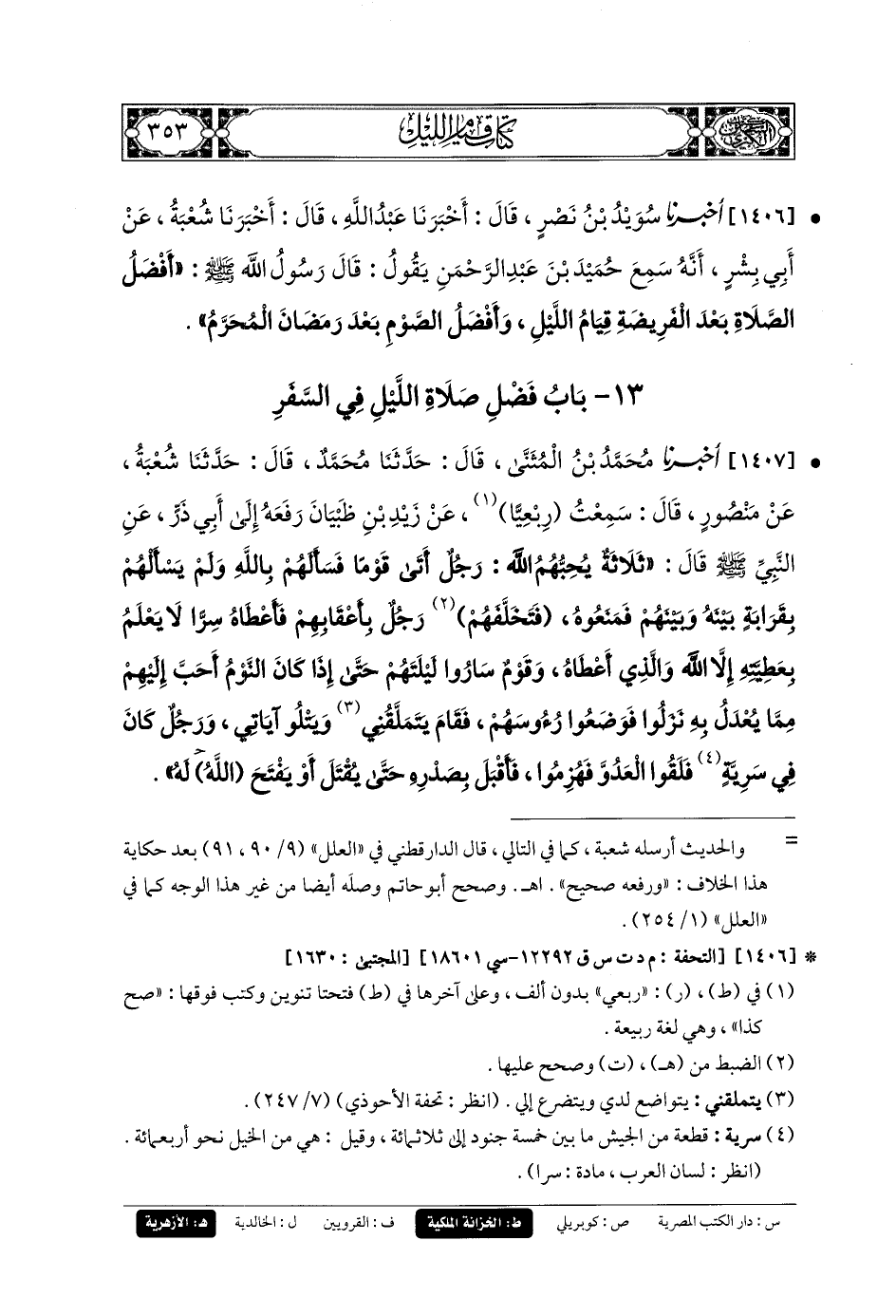 1406- أَخبَرنا سُوَيْدُ بنُ نَصْرٍ، قَالَ: أَخبَرنا عَبدُ اللهِ، قَالَ: أَخبَرنا شُعبَةُ، عَن أَبي بِشْرٍ، أَنَّهُ سَمِعَ حُمَيْدَ بْنَ عَبدِ الرَّحمَنِ يَقُولُ: قَالَ رَسُولُ اللهِ صَلى الله عَليه وسَلم: أَفْضَلُ الصَّلاةِ بَعْدَ الفَرِيضَةِ قِيَامُ اللَّيْلِ، وَأَفْضَلُ الصَّوْمِ بَعْدَ رَمَضَانَ المُحَرَّمُ.