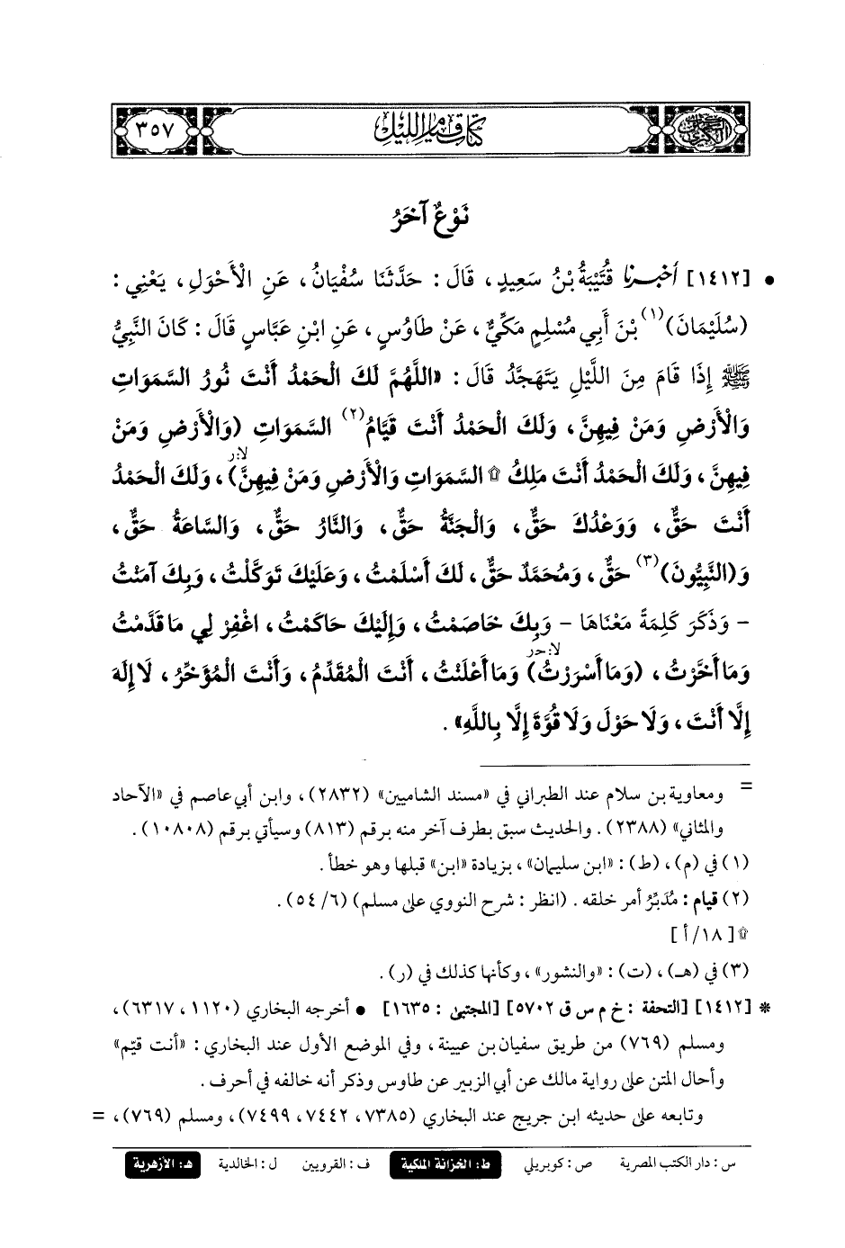 1412- أَخبَرنا قُتَيبَةُ بنُ سَعِيدٍ، قَالَ: حَدثنا سُفيانُ، عَنِ الأَحْوَلِ، يَعْنِي سُلَيمَانَ بنِ أَبي مُسْلِمٍ، مَكِّيٌّ، عَن طَاوُوسٍ، عَنِ ابنِ عَبَّاسٍ، قَالَ: كَانَ النَّبيُّ صَلى الله عَليه وسَلم إِذَا قَامَ مِنَ اللَّيْلِ يَتَهَجَّدُ قَالَ: اللهُمَّ لَكَ الحَمْدُ أَنْتَ نور السَّمَاوَاتِ وَالأَرْضِ وَمَنْ فِيهِنَّ، وَلَكَ الحَمْدُ أَنْتَ قَيَّامُ السَّمَاوَاتِ وَالأَرْضِ وَمَنْ فِيهِنَّ، وَلَكَ الحَمْدُ أَنْتَ مَلِكُ السَّمَاوَاتِ وَالأَرْضِ وَمَنْ فِيهِنَّ، وَلَكَ الحَمْدُ أَنْتَ حَقٌّ، وَوَعْدُكَ حَقٌّ، وَالجَنَّةُ حَقٌّ، وَالنَّارُ حَقٌّ، وَالسَّاعَةُ حَقٌّ، وَالنَّبيُّونَ حَقٌّ، وَمُحَمدٌ حَقٌّ، لَكَ أَسْلَمْتُ، وَعَلَيْكَ تَوَكَّلْتُ، وَبِكَ آمَنْتُ، وَذَكَرَ كَلِمَةً مَعَنَاهَا: وَبِكَ خَاصَمْتُ، وَإِلَيْكَ حَاكَمْتُ، اغْفِرْ لِي مَا قَدِمَتُ، وَمَا أَخَّرْتُ، وَمَا أَسْرَرْتُ، وَمَا أَعْلَنْتُ، أَنْتَ المُقَدِّمُ، وَأَنْتَ المُؤَخِّرُ، لا إِلَهَ إِلاَّ أَنْتَ، وَلا حَوْلَ وَلا قُوَّةَ إِلاَّ بِاللَّهِ.
