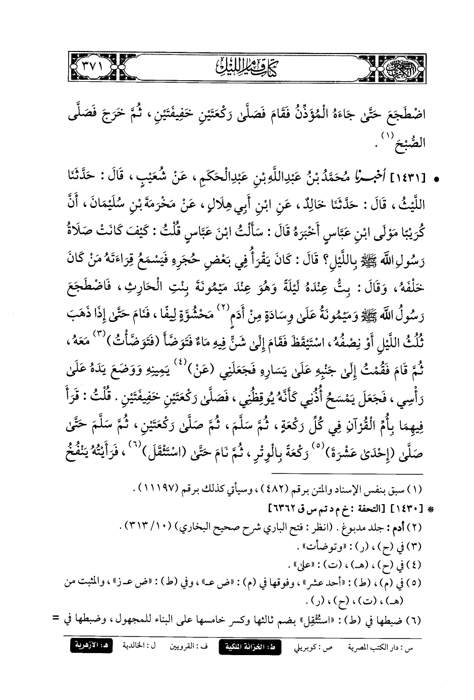 1431- أَخبَرنا مُحَمدُ بنُ عَبدِ اللهِ بنِ عَبدِ الحَكَمِ، عَن شُعَيبٍ، قَالَ: حَدثنا اللَّيْثُ، قَالَ: حَدثنا خَالِدٌ، عَنِ ابنِ أَبي هِلالٍ، عَن مَخْرَمَةَ بنِ سُلَيمَانَ، أَنَّ كُرَيْبًا، مَوْلَى ابنِ عَبَّاسٍ أَخبَرَهُ قَالَ: سَأَلْتُ ابنَ عَبَّاسٍ قُلْتُ: كَيْفَ كَانَتْ صَلاةُ رَسُولِ اللهِ صَلى الله عَليه وسَلم بِاللَّيْلِ؟ قَالَ: كَانَ يَقْرَأُ فِي بَعْضِ حُجَرِهِ، فَيَسْمَعُ قِرَاءَتَهُ مَنْ كَانَ خَلْفَهُ، وَقَالَ: بِتُّ عِنْدَهُ لَيْلَةً، وَهُوَ عِنْدَ مَيْمُونَةَ بِنْتِ الحَارِثِ، فَاضْطَجَعَ رَسُولُ اللهِ صَلى الله عَليه وسَلم، وَمَيْمُونَةُ عَلَى وِسَادَةٍ مِنْ أَدَمٍ مَحْشُوَّةٍ لِيفًا، فَنَامَ حَتَّى إِذَا ذَهَبَ ثُلُثُ اللَّيْلِ أَوْ نِصْفُهُ اسْتَيْقَظَ، فَقَامَ إِلَى شَنٍّ فِيهِ مَاءٌ، فَتَوَضَّأَ، فَتَوَضَّأْتُ مَعَهُ، ثُمَّ قَامَ، فَقُمْتُ إِلَى جَنْبِهِ عَلَى يَسَارِهِ، فَجَعَلَنِي عَن يَمِينِهِ، وَوَضَعَ يَدَهُ عَلَى رَأْسِي، فَجَعَلَ يَمْسَحُ أُذُنِي كَأَنَّهُ يُوقِظُنِي، فَصَلَّى رَكْعَتَيْنِ خَفِيفَتَيْنِ، قُلْتُ: قَرَأَ فِيهِمَا بِأُمِّ القُرْآنِ فِي كُلِّ رَكْعَةٍ؟! ثُمَّ سَلَّمَ، ثُمَّ صَلَّى رَكْعَتَيْنِ، ثُمَّ سَلَّمَ، حَتَّى صَلَّى إِحْدَى عَشْرَةَ رَكْعَةً بِالوِتْرِ، ثُمَّ نَامَ حَتَّى اسْتَثْقَلَ، فَرَأَيْتُهُ يَنْفُخُ، فَأَتَاهُ بِلالٌ، فَقَالَ: الصَّلاةَ يَا رَسُولَ اللهِ، فَقَامَ فَصَلَّى رَكْعَتَيْنِ، وَصَلَّى بِالنَّاسِ وَلَمْ يَتَوَضَّأْ.
