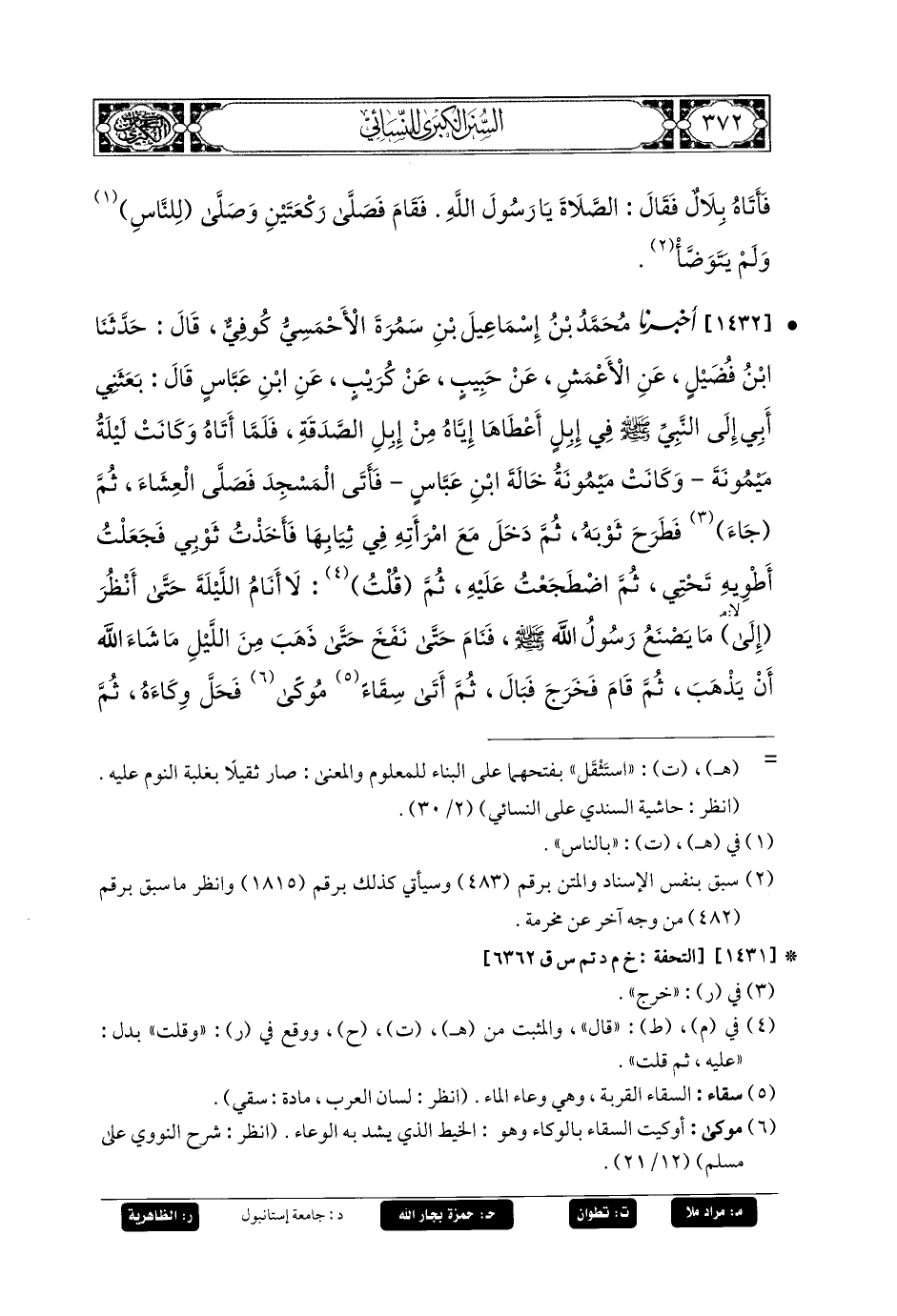 1432- أَخبَرنا مُحَمدُ بنُ إِسمَاعِيلَ بنِ سَمُرَةَ الأَحْمَسِيُّ، كُوفِيٌّ، قَالَ: حَدثنا ابنُ فُضَيْلٍ، عَنِ الأَعْمَشِ، عَن حَبِيبٍ، عَن كُرَيْبٍ، عَنِ ابنِ عَبَّاسٍ قَالَ: بَعَثَنِي أَبي إِلَى النَّبيِّ صَلى الله عَليه وسَلم فِي إِبِلٍ أَعْطَاهَا إِيَّاهُ مِنْ إِبِلِ الصَّدَقَةِ، فَلَمَّا أَتَاهُ، وَكَانَتْ لَيْلَةُ مَيْمُونَةَ، وَكَانَتْ مَيْمُونَةُ خَالَةَ ابنِ عَبَّاسٍ، فَأَتَى المَسْجِدَ فَصَلَّى العِشَاءَ، ثُمَّ جَاءَ، فَطَرَحَ ثَوْبَهُ، ثُمَّ دَخَلَ مَعَ امْرَأَتِهِ فِي ثِيَابِهَا، فَأَخَذْتُ ثَوْبِي، فَجَعَلْتُ أَطْوِيهِ تَحْتِي، ثُمَّ اضْطَجَعْتُ عَلَيْهِ، ثُمَّ قُلْتُ: لا أَنَامُ اللَّيْلَةَ حَتَّى أَنْظُرَ إِلَى مَا يَصْنَعُ رَسُولُ اللهِ صَلى الله عَليه وسَلم، فَنَامَ حَتَّى نَفَخَ، حَتَّى ذَهَبَ مِنَ اللَّيْلِ مَا شَاءَ اللهُ أَنْ يَذْهَبَ، ثُمَّ قَامَ، فَخَرَجَ، فَبَالَ، ثُمَّ أَتَى سِقَاءًا مُوكَى فَحَلَّ وِكَاءَهُ، ثُمَّ صَبَّ عَلَى يَدَيْهِ مِنَ المَاءِ، ثُمَّ وَطِئَ عَلَى فَمِ السِّقَاءِ فَجَعَلَ يَغْسِلُ يَدَيْهِ، ثُمَّ تَوَضَّأَ حَتَّى فَرَغَ، وَأَرَدْتُ أَنْ أَقُومَ فَأَصُبَّ عَلَيْهِ، فَخِفْتُ أَنْ يَدَعَ اللَّيْلَةَ مِنْ أَجْلِي، ثُمَّ قَامَ يُصَلِّي، فَقُمْتُ، فَفَعَلْتُ مِثْلَ الَّذِي فَعَلَ، ثُمَّ أَتَيْتُهُ، فَقُمْتُ عَن يَسَارِهِ، فَتَنَاوَلَنِي بِيَدِهِ فَأَقَامَنِي عَن يَمِينِهِ، فَصَلَّى ثَلاثَ عَشْرَةَ رَكْعَةً، ثُمَّ اضْطَجَعَ حَتَّى جَاءَهُ بِلالٌ فَأَذَّنَ بِالصَّلاةِ، فَقَامَ فَصَلَّى رَكْعَتَيْنِ قَبْلَ الفَجْرِ.