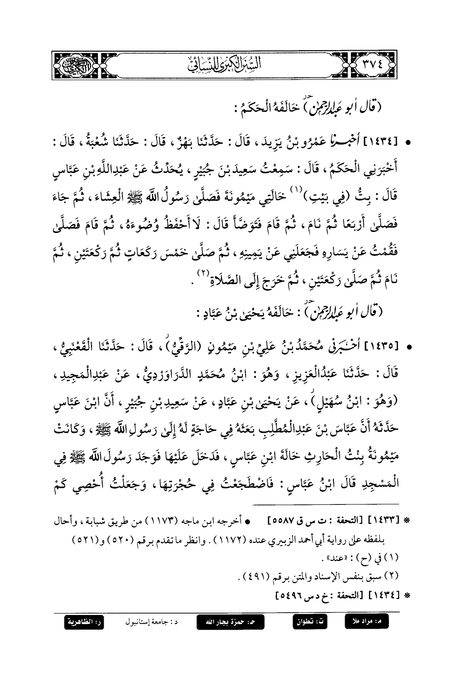 1435- أَخبَرني مُحَمدُ بنُ عَليِّ بنِ مَيْمُونٍ الرَّقِّيُّ، قَالَ: حَدثنا القَعْنَبِيُّ، قَالَ: حَدثنا عَبدُ العَزِيزِ، وَهُوَ ابنُ مُحَمدٍ الدَّرَاوَرْدِيُّ، عَن عَبدِ المَجِيدِ، هُوَ ابنُ سُهَيلٍ، عَن يَحيَى بنِ عَبَّادٍ، عَن سَعِيدِ بنِ جُبَيرٍ، أَنَّ ابنَ عَبَّاسٍ حَدَّثَهُ، أَنَّ عَبَّاسَ بْنَ عَبدِ المُطَّلِبِ بَعَثَهُ فِي حَاجَةٍ لَهُ إِلَى رَسُولِ اللهِ صَلى الله عَليه وسَلم، وَكَانَتْ مَيْمُونَةُ بِنْتُ الحَارِثِ خَالَةَ ابنَ عَبَّاسٍ، فَدَخَلَ عَلَيْهَا، فَوَجَدَ رَسُولَ اللهِ صَلى الله عَليه وسَلم فِي المَسْجِدِ، قَالَ ابنُ عَبَّاسٍ: فَاضْطَجَعْتُ فِي حُجْرَتِهَا، وَجَعَلْتُ أُحْصِي كَمْ يُصَلِّي رَسُولُ اللهِ صَلى الله عَليه وسَلم، فَجَاءَ وَأَنَا مُضْطَجِعٌ فِي الحُجْرَةِ بَعْدَ أَنْ ذَهَبَ اللَّيْلُ، فَقَالَ: رَقَدَ الوَلِيدُ؟ فَتَنَاوَلَ مِلْحَفَةً عَلَى مَيْمُونَةَ فَارْتَدَى بِبَعْضِهَا وَعَلَيْهَا بَعْضٌ، ثُمَّ قَامَ فَصَلَّى رَكْعَتَيْنِ رَكْعَتَيْنِ حَتَّى صَلَّى ثَمَانَ رَكَعَاتٍ، ثُمَّ أَوْتَرَ بِخَمْسٍ لَمْ يَجْلِسْ بَيْنَهُنَّ، ثُمَّ قَعَدَ فَأَثْنَى عَلَى اللهِ بِمَا هُوَ لَهُ أَهْلٌ، ثُمَّ أَكْثَرَ مِنَ الثَّنَاءِ.
