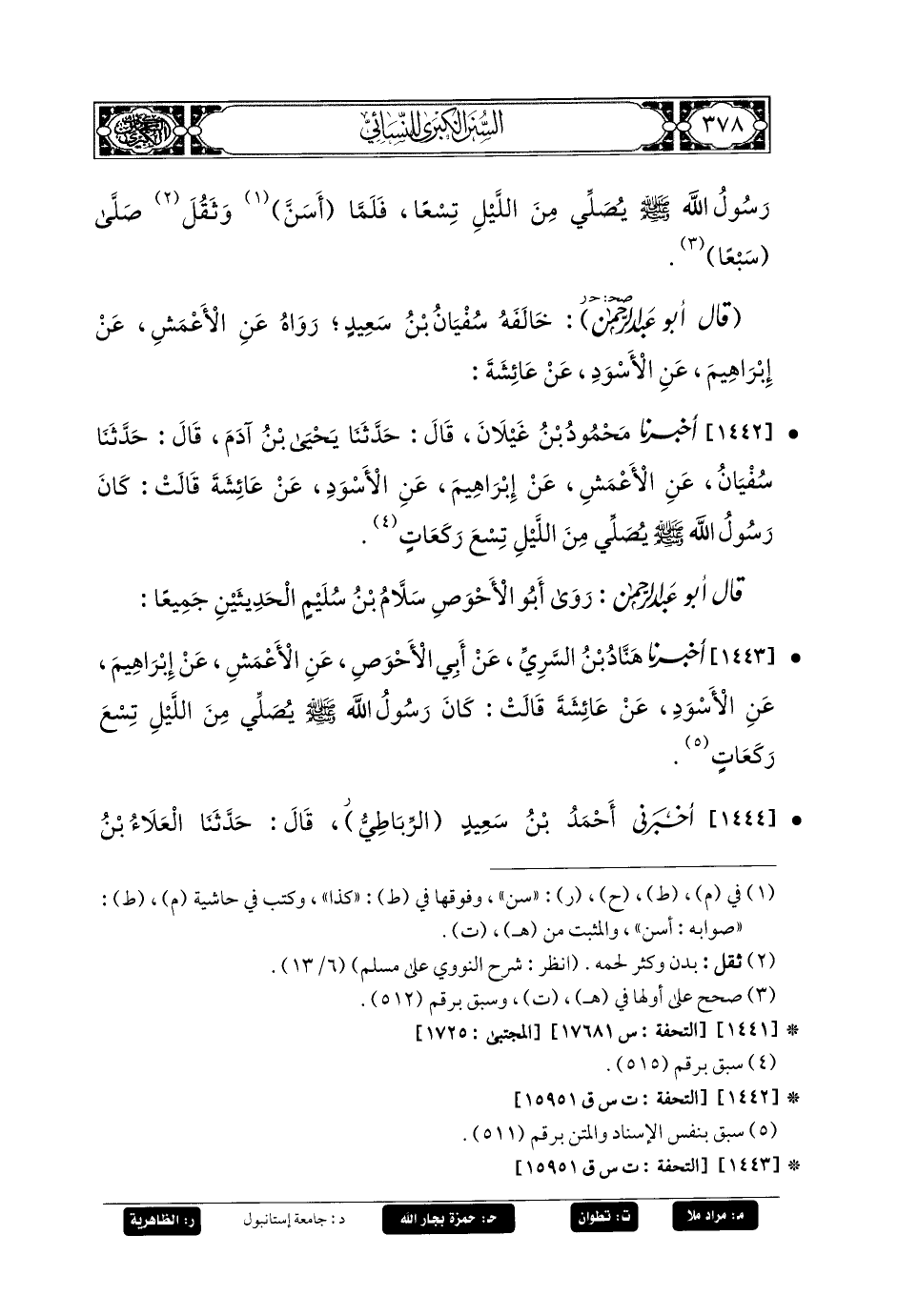 1444- أَخبَرني أَحْمَدُ بنُ سَعِيدٍ الرِّبَاطِيُّ، قَالَ: حَدثنا العَلاءُ بنُ عُصَيْمٍ، قَالَ: حَدثنا أَبو الأَحْوَصِ، عَنِ الأَعْمَشِ، عَن عُمَارَةَ بنِ عُمَيْرٍ، عَن يَحيَى بنِ الجَزَّارِ، عَن عَائِشَةَ: أَنَّ رَسُولَ اللهِ صَلى الله عَليه وسَلم كَانَ يُصَلِّي مِنَ اللَّيْلِ تِسْعَ رَكَعَاتٍ، فَلَمَّا كَثُرَ لَحْمُهُ وَأَسَنَّ صَلَّى سَبْعَ رَكَعَاتٍ.