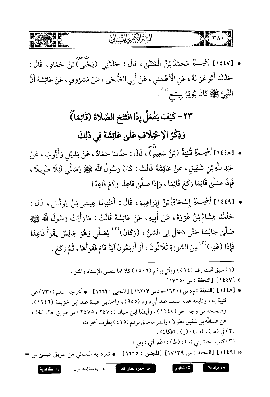 1447- أَخبَرنا مُحَمدُ بنُ المُثَنَّى، قَالَ: حَدَّثني يحيى بنُ حَمَّادٍ، قَالَ: حَدثنا أَبو عَوَانَةَ، عَنِ الأَعْمَشِ، عَن أَبي الضُّحَى، عَن مَسْرُوقٍ، عَن عَائِشَةَ: أَنَّ النَّبيَّ صَلى الله عَليه وسَلم كَانَ يُوتِرُ بِتِسْعٍ.
