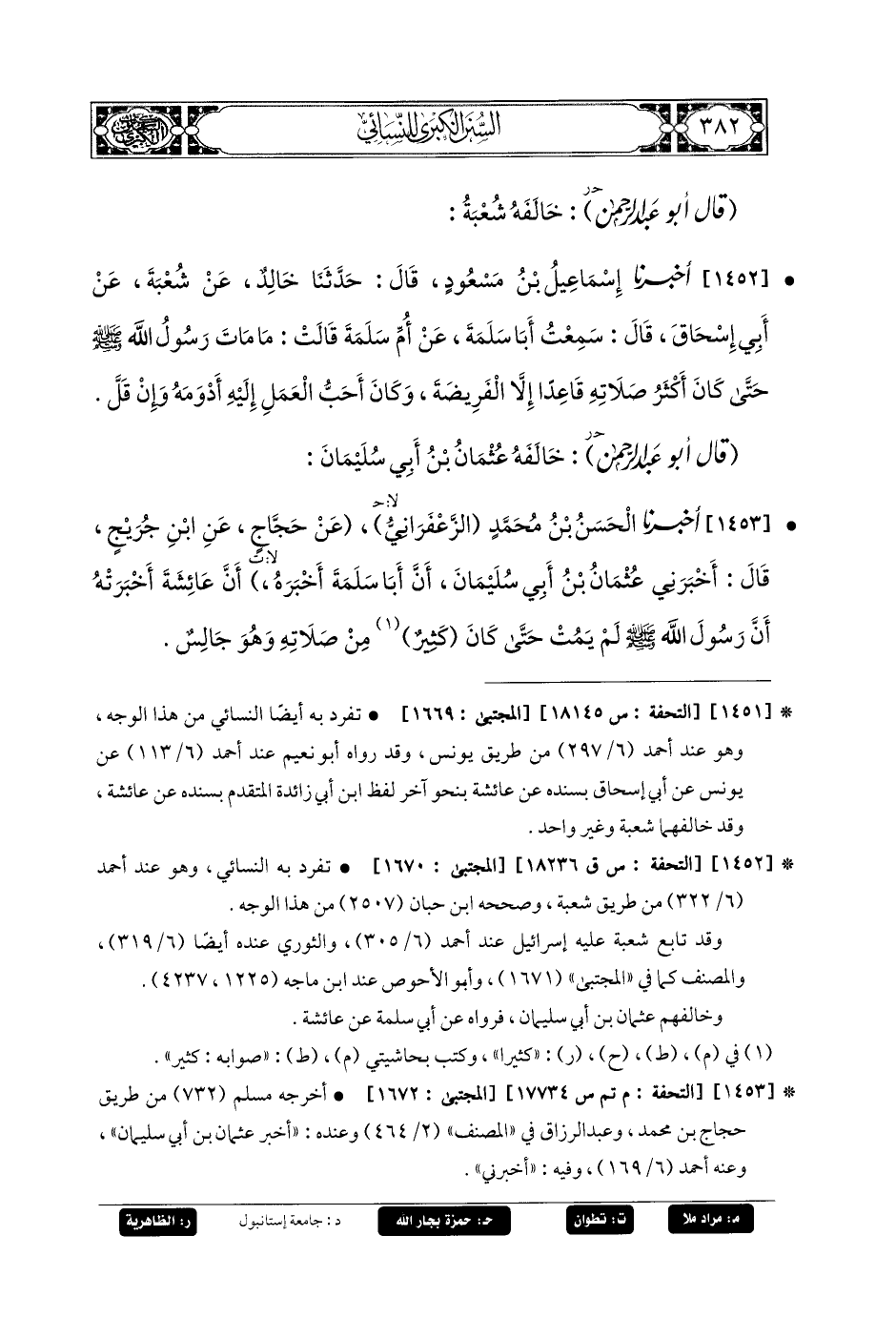 1453- أَخبَرنا الحَسَنُ بنُ مُحَمدٍ الزَّعْفَرَانِيُّ، عَن حَجَّاجٍ، عَنِ ابنِ جُرَيْجٍ، قَالَ: أَخبَرني عُثْمَانُ بنُ أَبي سُلَيمَانَ، أَنَّ أَبَا سَلَمَةَ أَخبَرَهُ؛ أَنَّ عَائِشَةَ أَخبَرَتْهُ: أَنَّ رَسُولَ اللهِ صَلى الله عَليه وسَلم لَمْ يَمُتْ حَتَّى كَانَ كَثِيرٌ مِنْ صَلاتِهِ وَهُوَ جَالِسٌ.