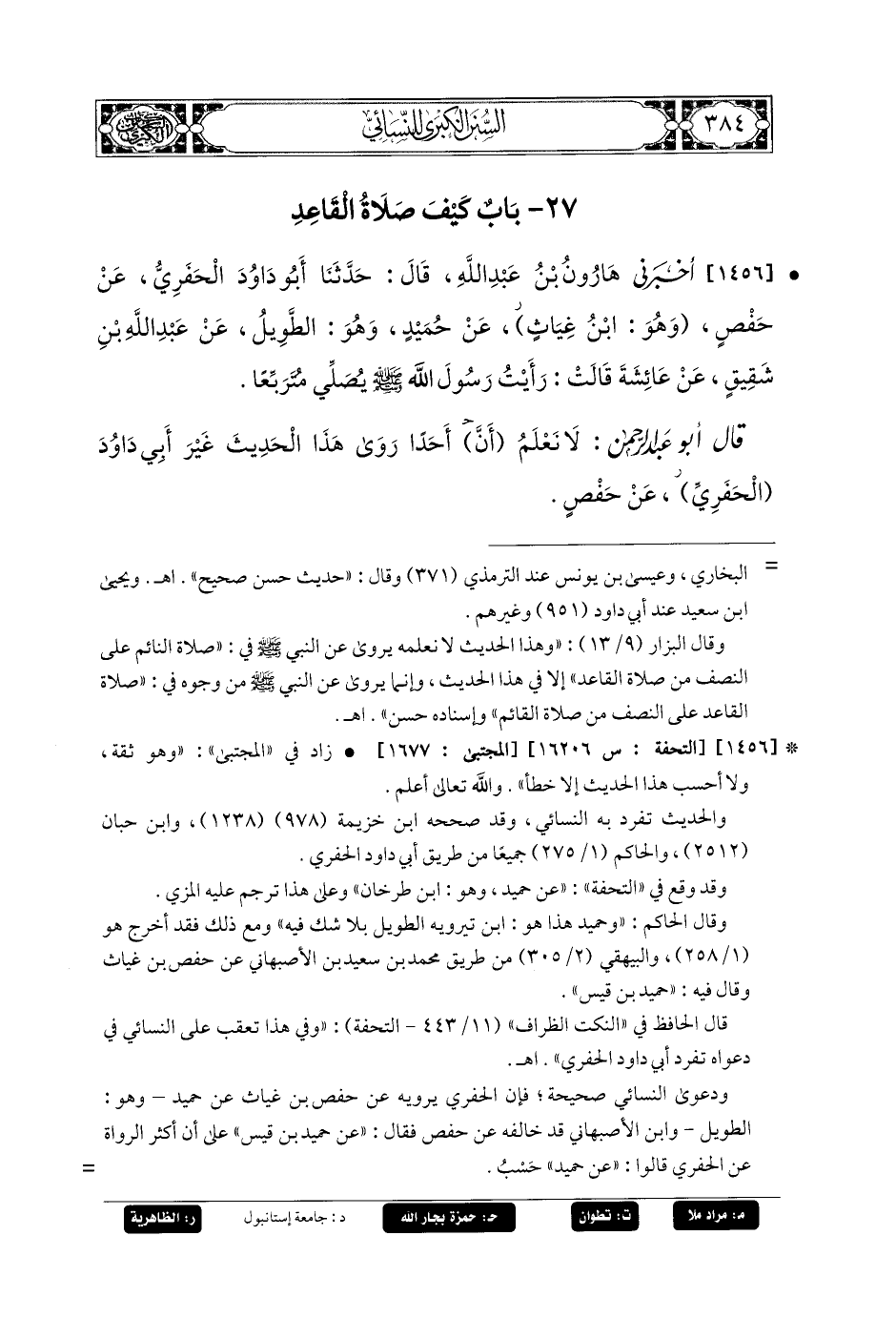 1456- أَخبَرني هَارُونُ بنُ عَبدِ اللهِ، قَالَ: أَخبَرنا أَبو دَاوُدَ الحَفَرِيُّ، عَن حَفْصٍ، وَهُوَ ابنُ غِيَاثٍ، عَن حُمَيْدٍ، وَهُو الطَّوِيلُ، عَن عَبدِ اللهِ بنِ شَقِيقٍ، عَن عَائِشَةَ، قَالَتْ: رَأَيْتُ رَسُولَ اللهِ صَلى الله عَليه وسَلم يُصَلِّي مُتَرَبِّعًا.