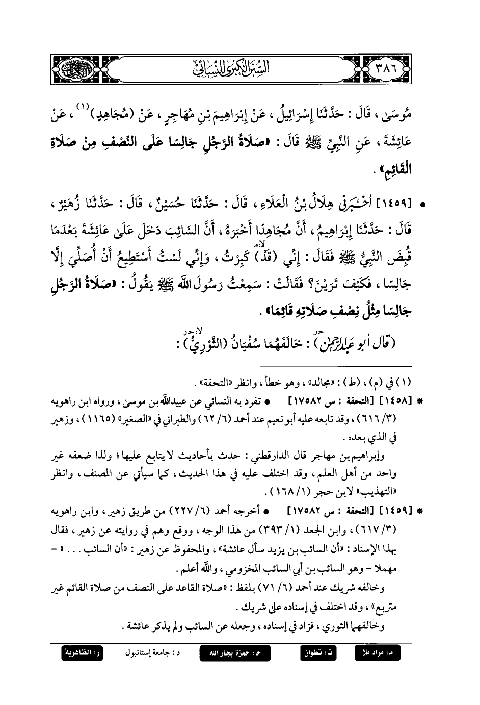 1459- أَخبَرني هِلالُ بنُ العَلاءِ، قَالَ: حَدثنا حُسَيْنٌ، قَالَ: حَدثنا زُهَيْرٌ، قَالَ: حَدثنا إِبرَاهِيمُ، أَنَّ مُجَاهِدًا أَخبَرَهُ؛ أَنَّ السَّائِبَ دَخَلَ عَلَى عَائِشَةَ بَعْدَ مَا قُبِضَ النَّبيُّ صَلى الله عَليه وسَلم فَقَالَ: إِنِّي قد كَبِرْتُ وَإِنِّي لَسْتُ أَسْتَطِيعُ أَنْ أُصَلِّيَ إِلاَّ جَالِسًا، فَكَيْفَ تَرَيْنَ؟ فَقَالَتْ: سَمِعْتُ رَسُولَ اللهِ صَلى الله عَليه وسَلم يَقُولُ: صَلاةُ الرَّجُلِ جَالِسًا مِثْلُ نِصْفِ صَلاتِهِ قَائِمًا.