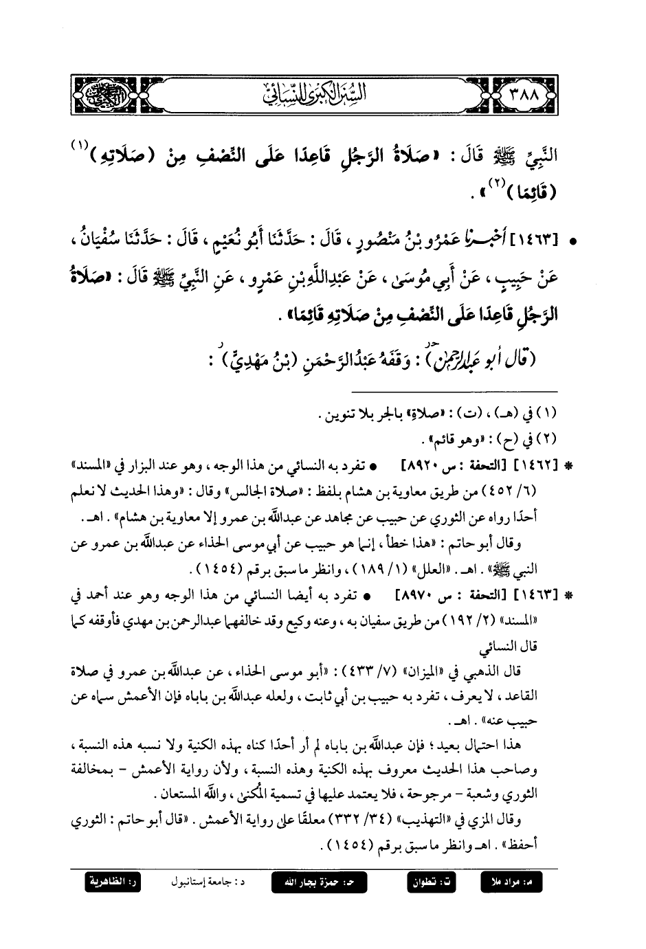1463- أَخبَرنا عَمرُو بنُ مَنصُورٍ، قَالَ: حَدثنا أَبو نُعَيْمٍ، قَالَ: حَدثنا سُفيانُ، عَن حَبِيبٍ، عَن أَبي مُوسَى، عَن عَبدِ اللهِ بنِ عَمْرٍو، عَنِ النَّبيِّ صَلى الله عَليه وسَلم قَالَ: صَلاةُ الرَّجُلِ قَاعِدًا عَلَى النِّصْفِ مِنْ صَلاتِهِ قَائِمًا.