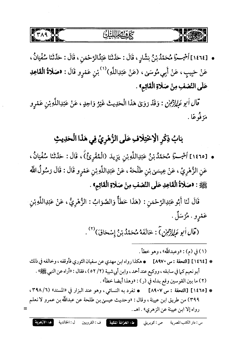 1464- أَخبَرنا مُحَمدُ بنُ بَشَّارٍ، قَالَ: حَدثنا عَبدُ الرَّحمَنٍ، قَالَ: حَدثنا سُفيانُ، عَن حَبِيبٍ، عَن أَبي مُوسَى، عَن عَبدِ اللهِ بنِ عَمْرٍو، قَالَ: صَلاةُ القَاعِدِ عَلَى النِّصْفِ مِنْ صَلاةِ القَائِمِ.