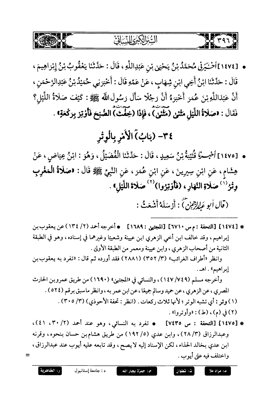 1475- أَخبَرنا قُتَيبَةُ بنُ سَعِيدٍ، قَالَ: حَدثنا الفُضَيْلُ، وَهُوَ ابنُ عِيَاضٍ، عَن هِشَامٍ، عَنِ ابنِ سِيرِينَ، عَنِ ابنِ عُمَرَ، عَنِ النَّبيِّ صَلى الله عَليه وسَلم قَالَ: صَلاةُ المَغْرِبِ وِتْرُ صَلاةِ النَّهَارِ، فَأَوْتِرُوا صَلاةَ اللَّيْلِ.