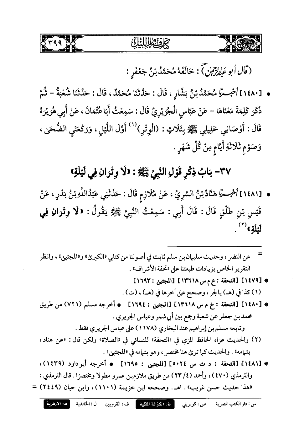 1481- أَخبَرنا هَنَادُ بنُ السَّرِيِّ، عَن مُلازِمٍ، قَالَ: حَدَّثني عَبدُ اللهِ بنُ بَدْرٍ، عَن قَيْسِ بنِ طَلْقٍ، قَالَ: قَالَ أَبي: سَمِعْتُ النَّبيَّ صَلى الله عَليه وسَلم يَقُولُ: لا وِتْرَانِ فِي لَيْلَةٍ.