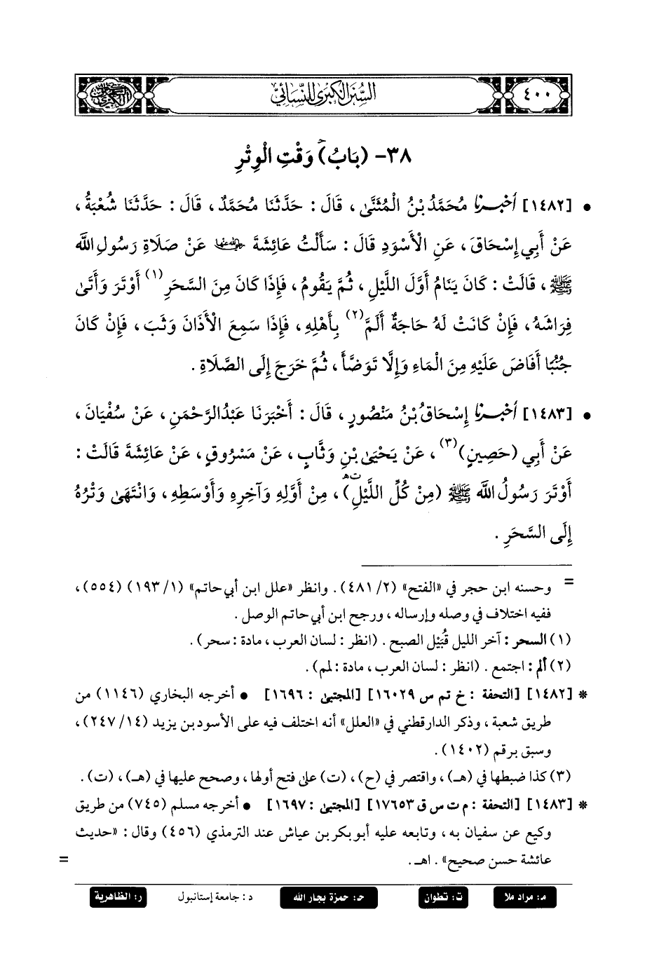 1482- أَخبَرنا مُحَمدُ بنُ المُثَنَّى، قَالَ: حَدثنا مُحَمدٌ، قَالَ: حَدثنا شُعبَةُ، عَن أَبي إِسحَاقَ، عَنِ الأَسْوَدِ، قَالَ: سَأَلْتُ عَائِشَةَ رضي الله عنها عَن صَلاةِ رَسُولِ اللهِ صَلى الله عَليه وسَلم قَالَتْ: كَانَ يَنَامُ أَوَّلَ اللَّيْلِ، ثُمَّ يَقُومُ، فَإِذَا كَانَ مِنَ السَّحَرِ أَوْتَرَ وَأَتَى فِرَاشَهُ، فَإِنْ كَانَتْ لَهُ حَاجَةً أَلَمَّ بِأَهْلِهِ، فَإِذَا سَمِعَ الأَذَانَ وَثَبَ، فَإِنْ كَانَ جُنُبًا أَفَاضَ عَلَيْهِ مِنَ المَاءِ، وَإِلاَّ تَوَضَّأَ، ثُمَّ خَرَجَ إِلَى الصَّلاةِ.