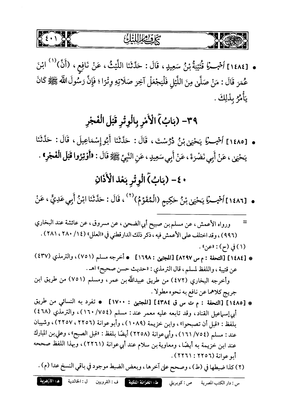 1484- أَخبَرنا قُتَيبَةُ بنُ سَعِيدٍ، قَالَ: حَدثنا اللَّيْثُ، عَن نَافِعٍ، أَنَّ ابنَ عُمَرَ قَالَ: مَنْ صَلَّى مِنَ اللَّيْلِ فَلْيَجْعَلْ آخِرَ صَلاتِهِ وِتْرًا، فَإِنَّ رَسُولَ اللهِ صَلى الله عَليه وسَلم كَانَ يَأْمُرُ بِذَلِكَ.