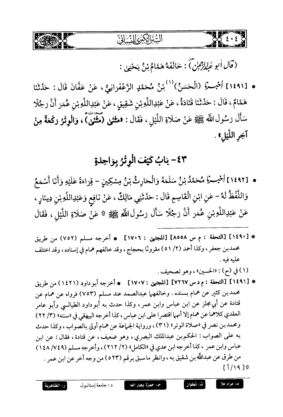 1491- أَخبَرنا الحَسَنُ بنُ مُحَمدٍ الزَّعْفَرَانِيُّ، عَن عَفَّانَ، قَالَ: حَدثنا هَمَّامٌ، قَالَ: حَدثنا قَتَادَةُ، عَن عَبدِ اللهِ بنِ شَقِيقٍ، عَن عَبدِ اللهِ بنِ عُمَرَ، أَنَّ رَجُلاً سَأَلَ رَسُولَ اللهِ صَلى الله عَليه وسَلم عَن صَلاةِ اللَّيْلِ، فَقَالَ: مَثْنَى مَثْنَى، وَالوَتْرُ رَكْعَةٌ مِنْ آخِرِ اللَّيْلِ.