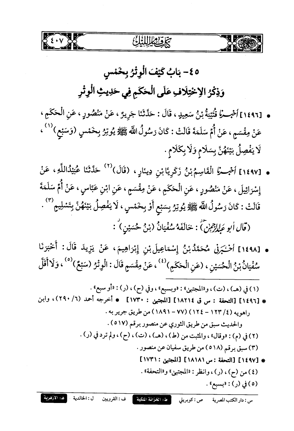 1496- أَخبَرنا قُتَيبَةُ بنُ سَعِيدٍ، قَالَ: حَدثنا جَرِيرٌ، عَن مَنصُورٍ، عَنِ الحَكَمِ، عَن مِقْسَمٍ، عَن أُمِّ سَلَمَةَ، قَالَتْ: كَانَ رَسُولُ اللهِ صَلى الله عَليه وسَلم يُوتِرُ بِخَمْسٍ وبِسَبْعٍ، لا يَفْصِلُ بَيْنَهُنَّ بِسَلامٍ وَلا بِكَلامٍ.