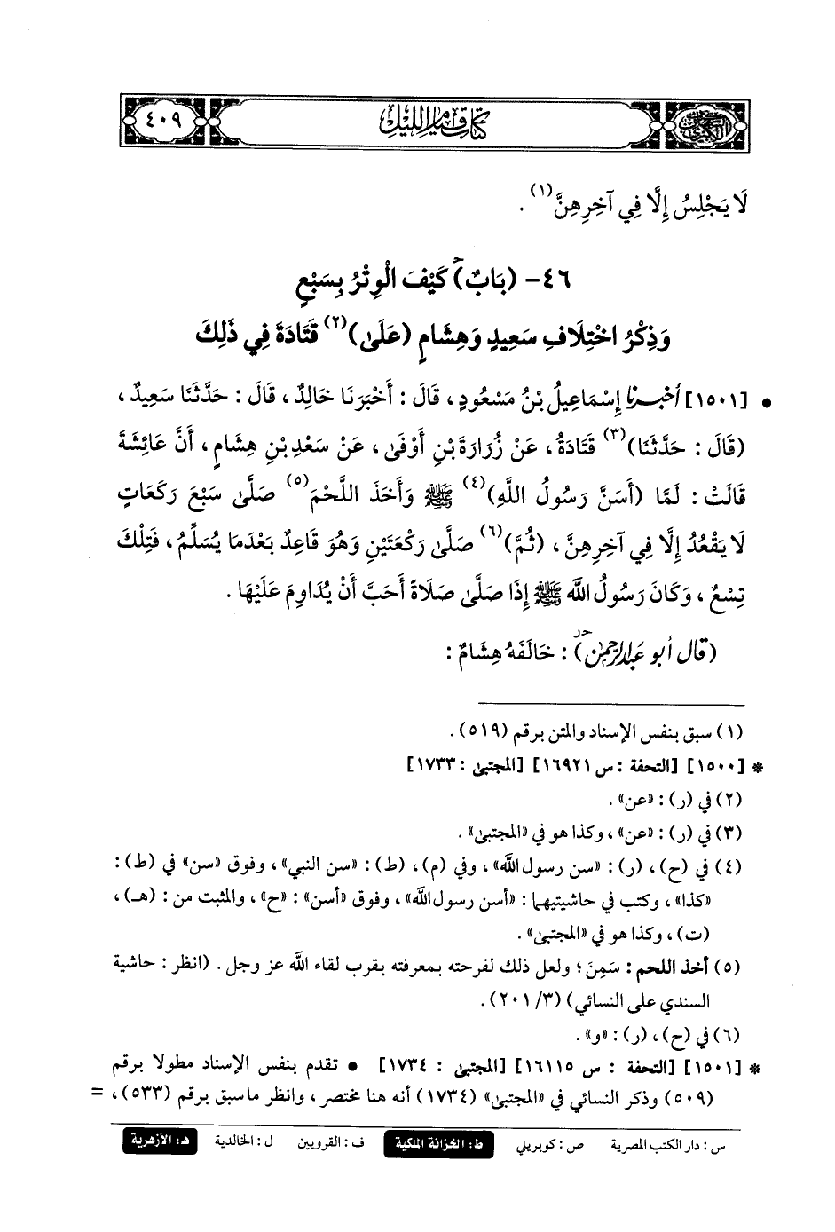 1501- أَخبَرنا إِسمَاعِيلُ بنُ مَسْعُودٍ، قَالَ: أَخبَرنا خَالِدٌ، قَالَ: حَدثنا سَعِيدٌ، قَالَ: حَدثنا قَتَادَةُ، عَن زُرَارَةَ بنِ أَوْفَى، عَن سَعْدِ بنِ هِشَامٍ، أَنَّ عَائِشَةَ، قَالَتْ: لَمَّا أَسَنَّ رَسُولُ اللهِ صَلى الله عَليه وسَلم، وَأَخَذَ اللَّحْمَ، صَلَّى سَبْعَ رَكَعَاتٍ، لا يَقْعُدُ إِلاَّ فِي آخِرِهِنَّ، ثُمَّ صَلَّى رَكْعَتَيْنِ وَهُوَ قَاعِدٌ بَعْدَ مَا يُسَلِّمُ، فَتِلْكَ تِسْعٌ، وَكَانَ رَسُولُ اللهِ صَلى الله عَليه وسَلم إِذَا صَلَّى صَلاةً أَحَبَّ أَنْ يُدَاوِمَ عَلَيْهَا.