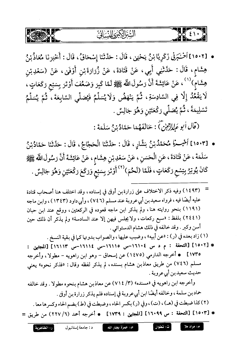 1502- أَخبَرني زَكَرِيَّا بنُ يَحيَى، قَالَ: حَدثنا إِسحَاقُ، قَالَ: أَخبَرنا مُعَاذُ بنُ هِشَامٍ، قَالَ: حَدَّثني أَبي، عَن قَتَادَةَ، عَن زُرَارَةَ بنِ أَوْفَى، عَن سَعْدِ بنِ هِشَامٍ، عَن عَائِشَةَ: أَنَّ رَسُولَ اللهِ صَلى الله عَليه وسَلم لَمَّا كَبِرَ وَضَعُفَ أَوْتَرَ بِسَبْعِ رَكَعَاتٍ، لا يَقْعُدُ إِلاَّ فِي السَّادِسَةِ، ثُمَّ يَنْهَضُ وَلا يُسَلِّمُ فَيُصَلِّي السَّابِعَةَ، ثُمَّ يُسَلِّمُ تَسْلِيمَةً، ثُمَّ يُصَلِّي رَكْعَتَيْنِ وَهُوَ جَالِسٌ.