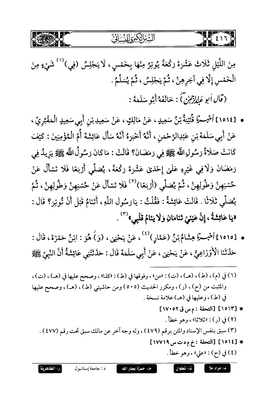 1514- أَخبَرنا قُتَيبَةُ بنُ سَعِيدٍ، عَن مَالِكٍ، عَن سَعِيدِ بنِ أَبي سَعِيدٍ المَقْبُرِيِّ، عَن أَبي سَلَمَةَ بنِ عَبدِ الرَّحمَنِ، أَنَّهُ أَخبَرَهُ، أَنَّهُ سَأَلَ عَائِشَةَ أُمَّ المُؤْمِنِينَ: كَيْفَ كَانَتْ صَلاةُ رَسُولِ اللهِ صَلى الله عَليه وسَلم فِي رَمَضَانَ؟ قَالَتْ: مَا كَانَ رَسُولُ اللهِ صَلى الله عَليه وسَلم يَزِيدُ فِي رَمَضَانَ وَلا فِي غَيْرِهِ، عَلَى إِحْدَى عَشْرَةِ رَكْعَةً، يُصَلِّي أَرْبَعًا، فَلا تَسْأَلْ عَن حُسْنِهِنَّ وَطُولِهِنَّ، ثُمَّ يُصَلِّي أَرْبَعًا، فَلا تَسْأَلْ عَن حُسْنِهِنَّ وَطُولِهِنَّ، ثُمَّ يُصَلِّي ثَلاثًا، قَالَتْ عَائِشَةُ: فَقُلْتُ: يَا رَسُولَ اللهِ، أَتَنَامُ قَبْلَ أَنْ تُوتِرَ؟ قَالَ: يَا عَائِشَةُ، إِنَّ عَيْنِيَّ تَنَامَانِ، وَلا يَنَامُ قَلْبِي.
