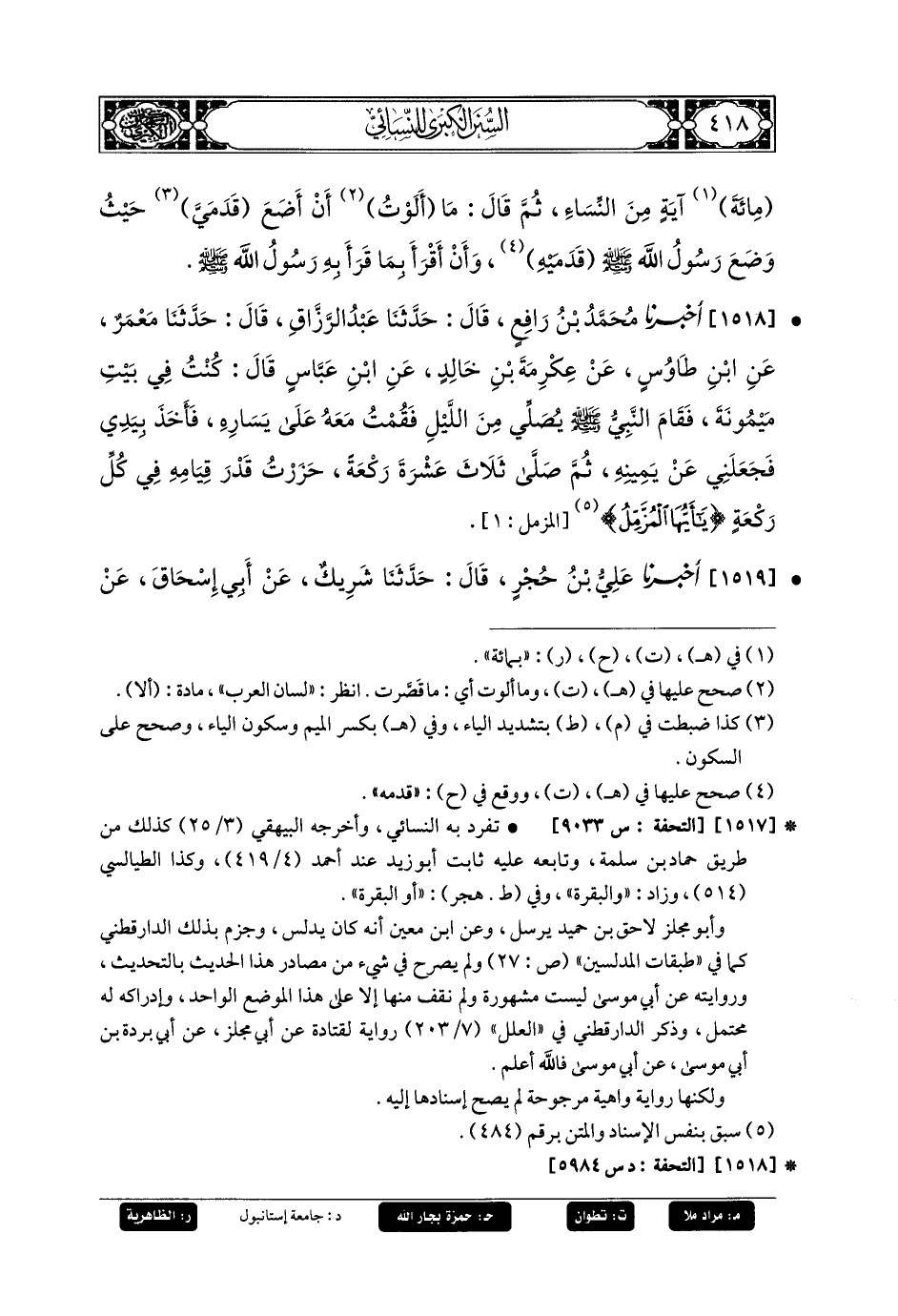 1518- أَخبَرنا مُحَمدُ بنُ رَافِعٍ، قَالَ: حَدثنا عَبدُ الرَّزَّاقِ، قَالَ: حَدثنا مَعْمَرٌ: عَنِ ابنِ طَاوُوسَ، عَن عِكْرِمَةَ بنِ خَالِدٍ، عَنِ ابنِ عَبَّاسٍ، قَالَ: كُنْتُ فِي بَيْتِ مَيْمُونَةَ، فَقَامَ النَّبيُّ صَلى الله عَليه وسَلم يُصَلِّي مِنَ اللَّيْلِ، فَقُمْتُ مَعَهُ عَلَى يَسَارِهِ، فَأَخَذَ بِيَدِي فَجَعَلَنِي عَن يَمِينِهِ، ثُمَّ صَلَّى ثَلاثَ عَشْرَةَ رَكْعَةً، حَزَرْتُ قَدْرَ قِيَامِهِ فِي كُلِّ رَكْعَةٍ {يَا أَيُّهَا المُزَّمِّلُ}.
