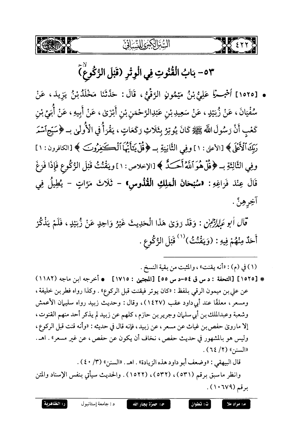 1525- أَخبَرنا عَليُّ بنُ مَيْمُونٍ الرَّقِّيُّ، قَالَ: حَدثنا مَخْلَدُ بنُ يَزِيدَ، عَن سُفيانَ، عَن زُبَيْدٍ، عَن سَعِيدِ بنِ عَبدِ الرَّحمَنِ بنِ أَبْزَى، عَن أَبيهِ، عَن أُبَيِّ بنِ كَعْبٍ: أَنَّ رَسُولَ اللهِ صَلى الله عَليه وسَلم كَانَ يُوتِرُ بِثَلاثِ رَكَعَاتٍ، يَقْرَأُ فِي الأُولَى بِـ {سَبِّحِ اسْمَ رَبِّكَ الأَعْلَى} وَفِي الثَّانِيَةِ بِـ {قُلْ يَا أَيُّهَا الكَافِرُونَ} وَفِي الثَّالِثَةِ بِـ {قُلْ هُوَ اللهُ أَحَدٌ} وَيَقْنُتُ قَبْلَ الرُّكُوعِ، فَإِذَا فَرَغَ قَالَ عِنْدَ فَرَاغِهِ: سُبْحَانَ المَلِكِ القُدُّوسِ، ثَلاثَ مَرَّاتٍ يُطِيلُ فِي آخِرِهِنَّ.
