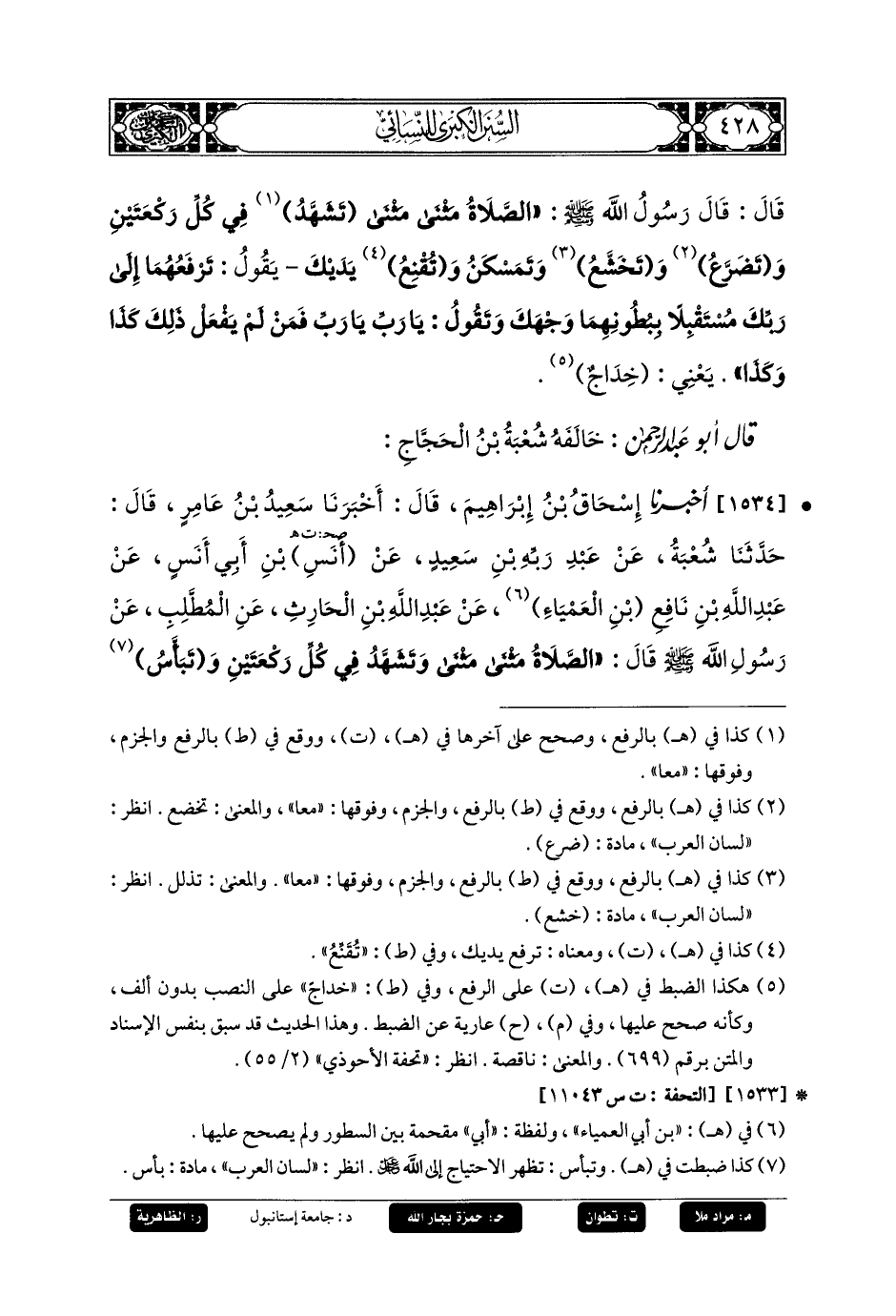 1534- أَخبَرنا إِسحَاقُ بنُ إِبرَاهِيمَ، قَالَ: أَخبَرنا سَعِيدُ بنُ عَامِرٍ، قَالَ: حَدثنا شُعبَةُ، عَن عَبدِ رَبِّهِ بنِ سَعِيدٍ، عَن أَنَسِ بنِ أَبي أَنَسٍ، عَن عَبدِ اللهِ بنِ نَافِعِ بنِ العَمْيَاءِ، عَن عَبدِ اللهِ بنِ الحَارِثِ، عَنِ المُطَّلِبِ، عَن رَسُولِ اللهِ صَلى الله عَليه وسَلم قَالَ: الصَّلاةُ مَثْنَى مَثْنَى، وَتَشَهَّدُ فِي كُلِّ رَكْعَتَيْنِ، وَتَبَأَّسُ وَتَمَسْكَنُ، وَتُقْنِعُ يَدَيْكَ، وَتَقُولُ: اللهُمَّ اللهُمَّ، فَمَنْ لَمْ يَفْعَلْ ذَلِكَ فَهِي خِدَاجٌ.