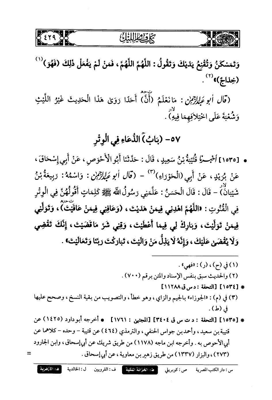 1535- أَخبَرنا قُتَيبَةُ بنُ سَعِيدٍ، قَالَ: حَدثنا أَبو الأَحْوَصِ، عَن أَبي إِسحَاقَ، عَن بُرَيْدٍ، عَن أَبي الحَوْرَاءِ، قَالَ أَبو عَبدِ الرَّحمَنِ: وَاسْمُهُ رَبِيعَةُ بنُ شَيْبَانَ، قَالَ: قَالَ الحَسَنُ بنُ عَليٍّ: عَلَّمَنِي رَسُولُ اللهِ صَلى الله عَليه وسَلم كَلِمَاتٍ أَقُولُهُنَّ فِي الوِتْرِ فِي القُنُوتِ: اللهُمَّ اهْدِنِي فِيمَنْ هَدَيْتَ، وَعَافِنِي فِيمَنْ عَافَيْتَ، وَتَوَلَّنِي فِيمَنْ تَوَلَّيْتَ، وَبَارِكْ لِي فِيمَا أَعْطَيْتَ، وَقِنِي شَرَّ مَا قَضَيْتَ، إِنَّكَ تَقْضِي وَلا يُقْضَى عَلَيْكَ، وَإِنَّهُ لا يَذِلُّ مَنْ وَالَيْتَ، تَبَارَكْتَ رَبَّنَا وَتَعَالَيْتَ.