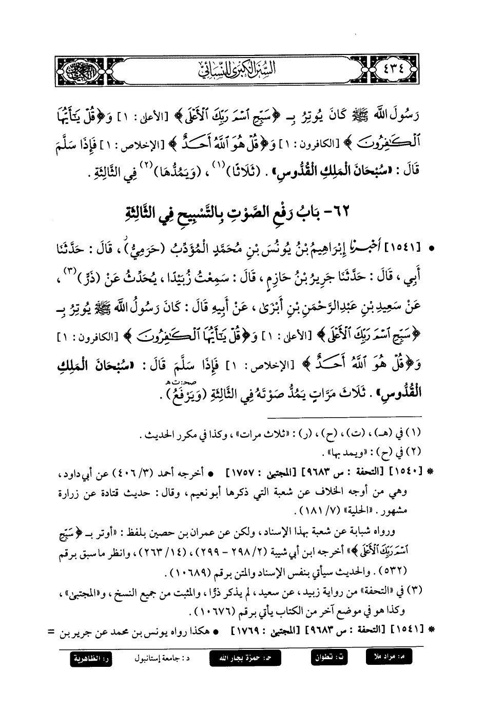 1541- أَخبَرنا إِبرَاهِيمُ بنُ يُونُسَ بنِ مُحَمدٍ المُؤَدِّبُ حَرَمِيٌّ، قَالَ: حَدثنا أَبي، قَالَ: حَدثنا جَرِيرُ بنُ حَازِمٍ، قَالَ: سَمِعْتُ زُبَيْدًا يُحَدِّثُ، عَن ذَرٍّ، عَن سَعِيدِ بنِ عَبدِ الرَّحمَنِ بنِ أَبْزَى، عَن أَبيهِ، قَالَ: كَانَ رَسُولُ اللهِ صَلى الله عَليه وسَلم يُوتِرُ بِـ {سَبِّحِ اسْمَ رَبِّكَ الأَعْلَى}، وَ{قُلْ يَا أَيُّهَا الكَافِرُونَ}، وَ{قُلْ هُوَ اللهُ أَحَدٌ} فَإِذَا سَلَّمَ قَالَ: سُبْحَانَ المَلِكِ القُدُّوسِ ثَلاثَ مَرَّاتٍ، يَمُدُّ صَوْتَهُ فِي الثَّالِثَةِ وَيَرْفَعُ.