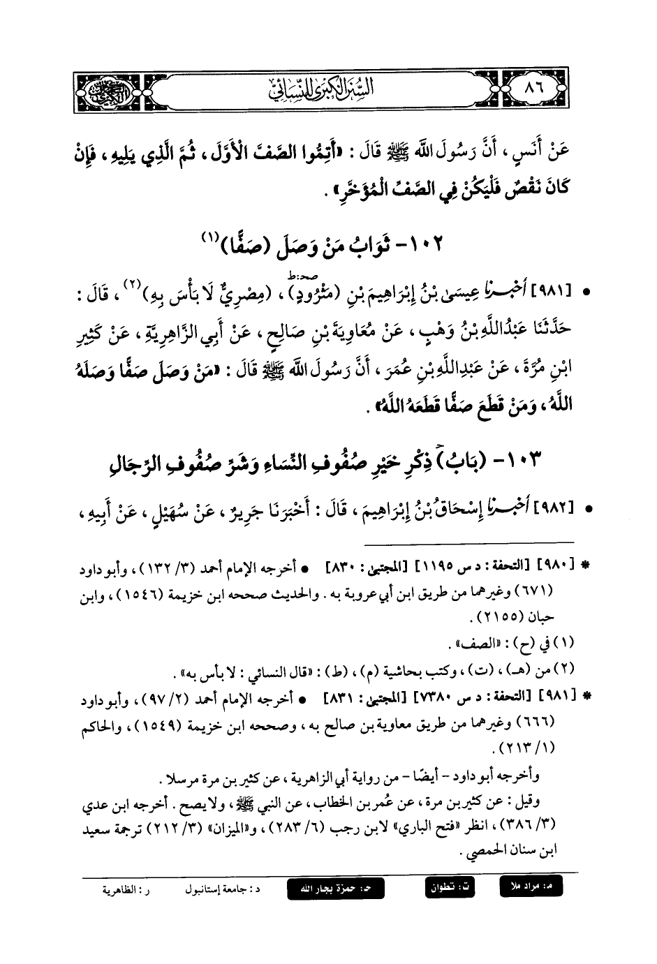 981- أَخبَرنا عِيسَى بنُ إِبرَاهِيمَ بنِ مَثْرُودٍ مصري لا بأس به، قَالَ: حَدثنا عَبدُ اللهِ بنُ وَهْبٍ، عَن مُعاويَةَ بنِ صَالِحٍ، عَن أَبي الزَّاهِرِيَّةِ، عَن كَثِيرِ بنِ مُرَّةَ، عَن عَبدِ اللهِ بنِ عُمَرَ، أَنَّ رَسُولَ اللهِ صَلى الله عَليه وسَلم قَالَ: مَنْ وَصَلَ صَفًّا وَصَلَهُ اللهُ، وَمَنْ قَطَعَ صَفًّا قَطَعَهُ اللهُ.
