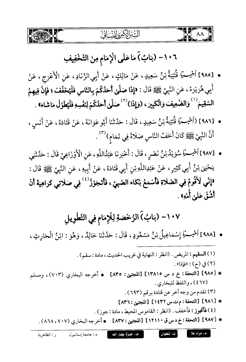 985- أَخبَرنا قُتَيبَةُ بنُ سَعِيدٍ، عَن مَالِكٍ، عَن أَبي الزِّنَادِ، عَنِ الأَعْرَجِ، عَن أَبي هُرَيرَةَ، عَنِ النَّبيِّ صَلى الله عَليه وسَلم قَالَ: إِذَا صَلَّى أَحَدُكُمْ بِالنَّاسِ فَلْيُخَفِّفْ، فَإِنَّ فِيهِمُ السَّقِيمُ، وَالضَّعِيفُ، وَالكَبِيرُ، وَإِذَا صَلَّى أَحَدُكُمْ لِنَفْسِهِ فَلْيُطَوِّلْ مَا شَاءَ.